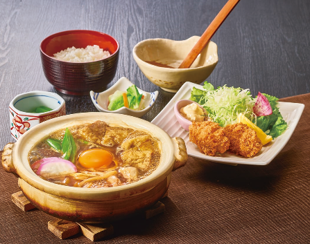 みそ煮込販売数日本一のサガミがお届けするみそ煮込と大粒のかきフライが2粒セットになったお値打ちのセットメニューです。