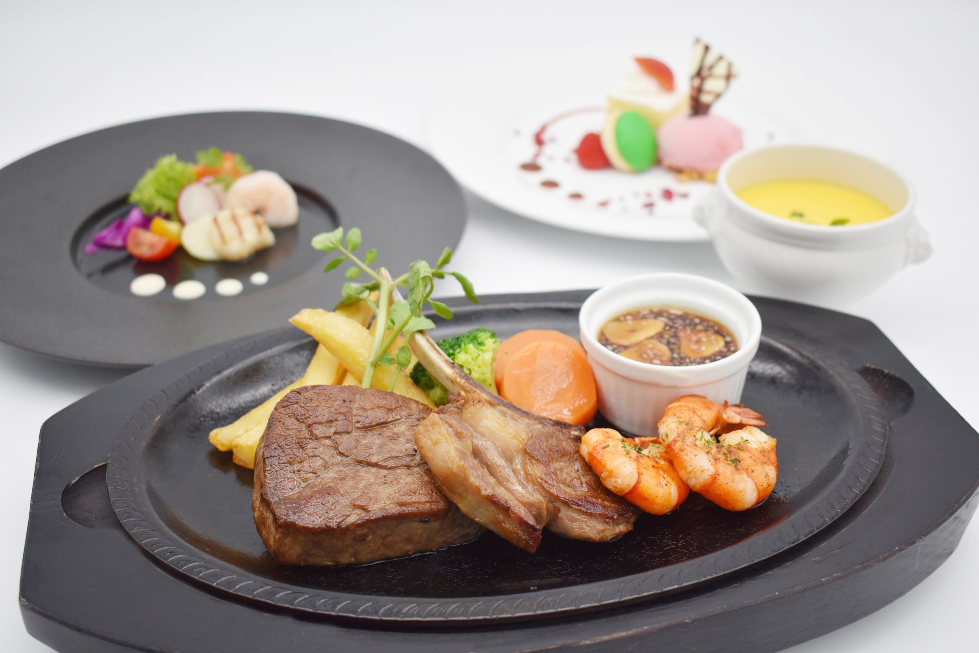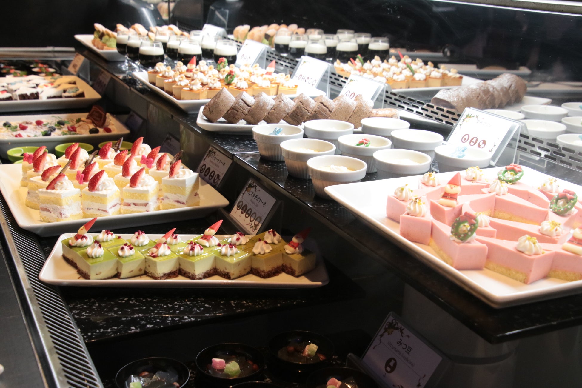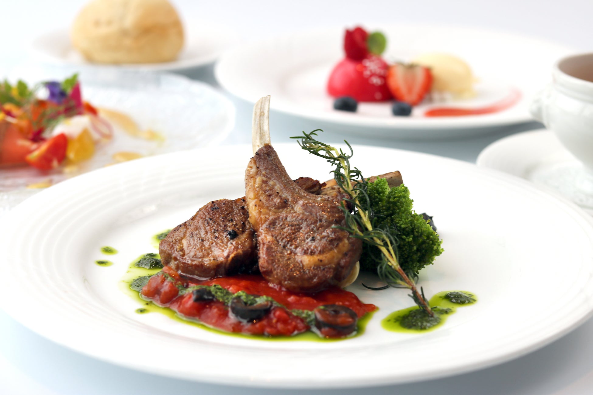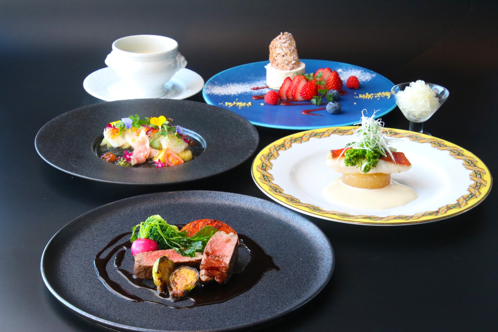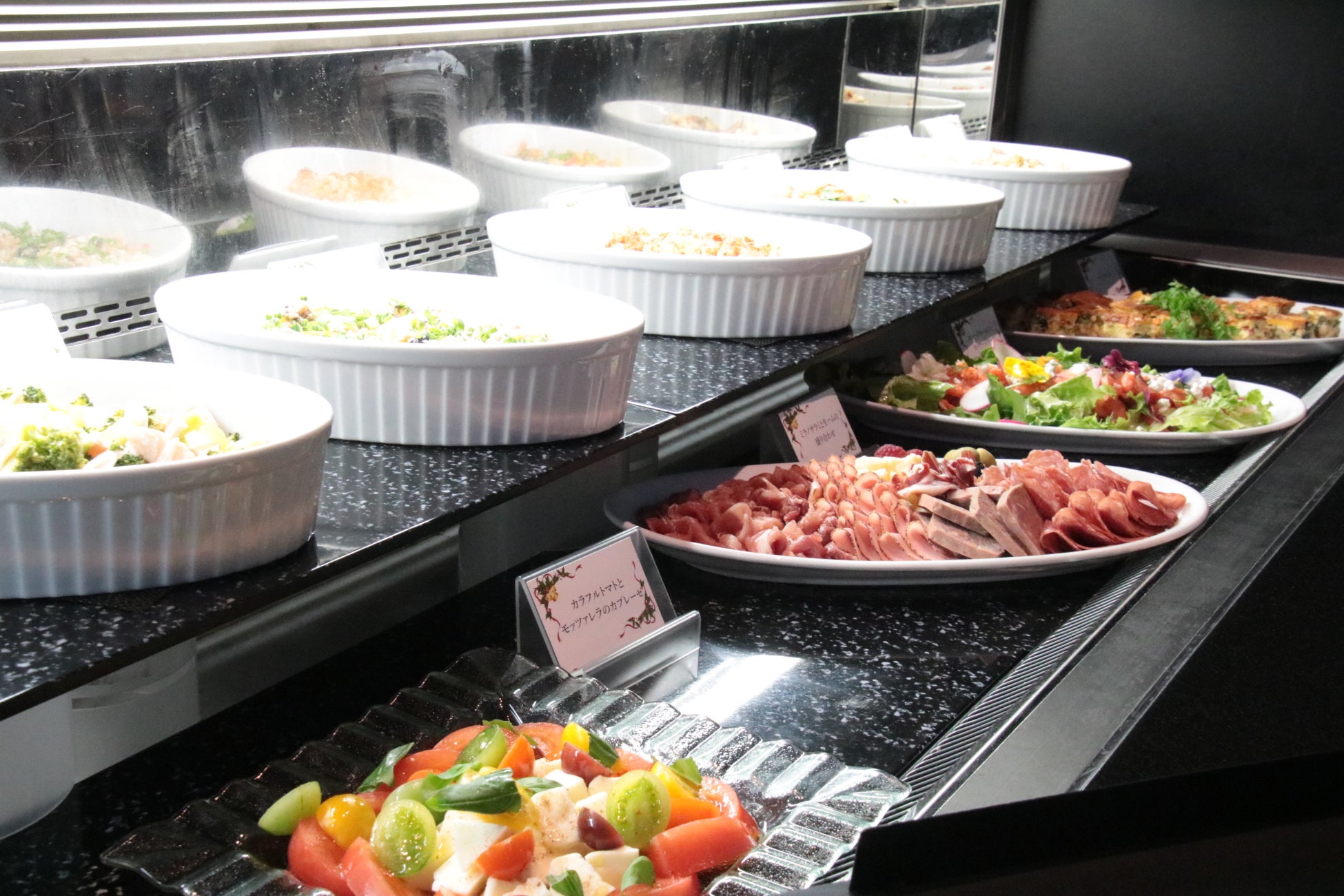 メニュー例:デリカビュッフェ(スモークサーモン、チーズ盛り、イカとJシリアルサラダ、神奈川野菜のバーニャカウダーなど)、テーブルサービス料理(オマール海老と帆立のポワレ、牛ヒレ肉ロースト ロッシーニ風)、スイーツビュッフェ(苺ショートケーキ、クグロフ、フォレノワール等)