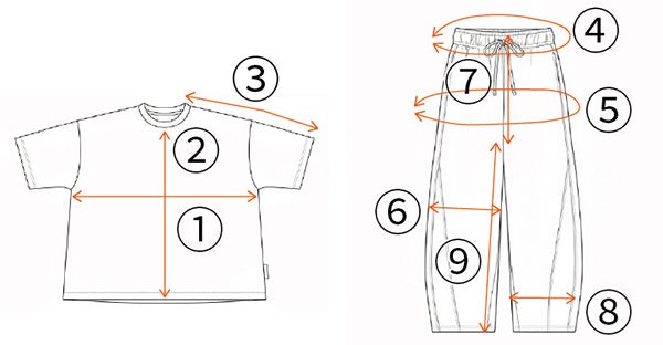 ボトムス ➃ウエスト ➄ヒップ ➅わたり ➆股上 ➇裾幅 ➈股下