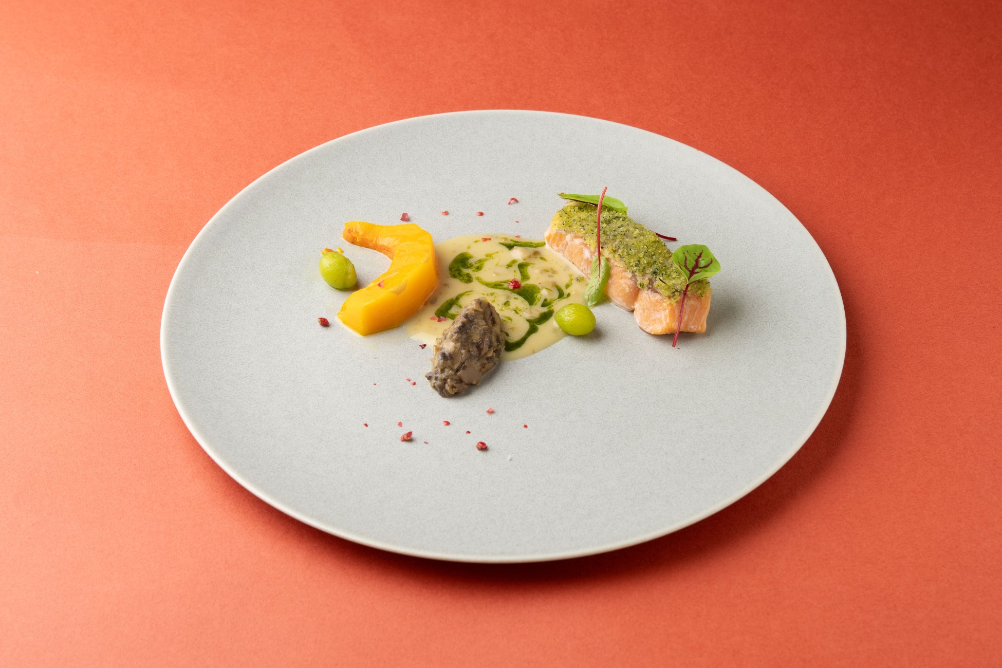 サーモンのコンフィに香草パン粉をつけてしっとりと焼き上げました。香り高いヴェルモットのソースを添えて。