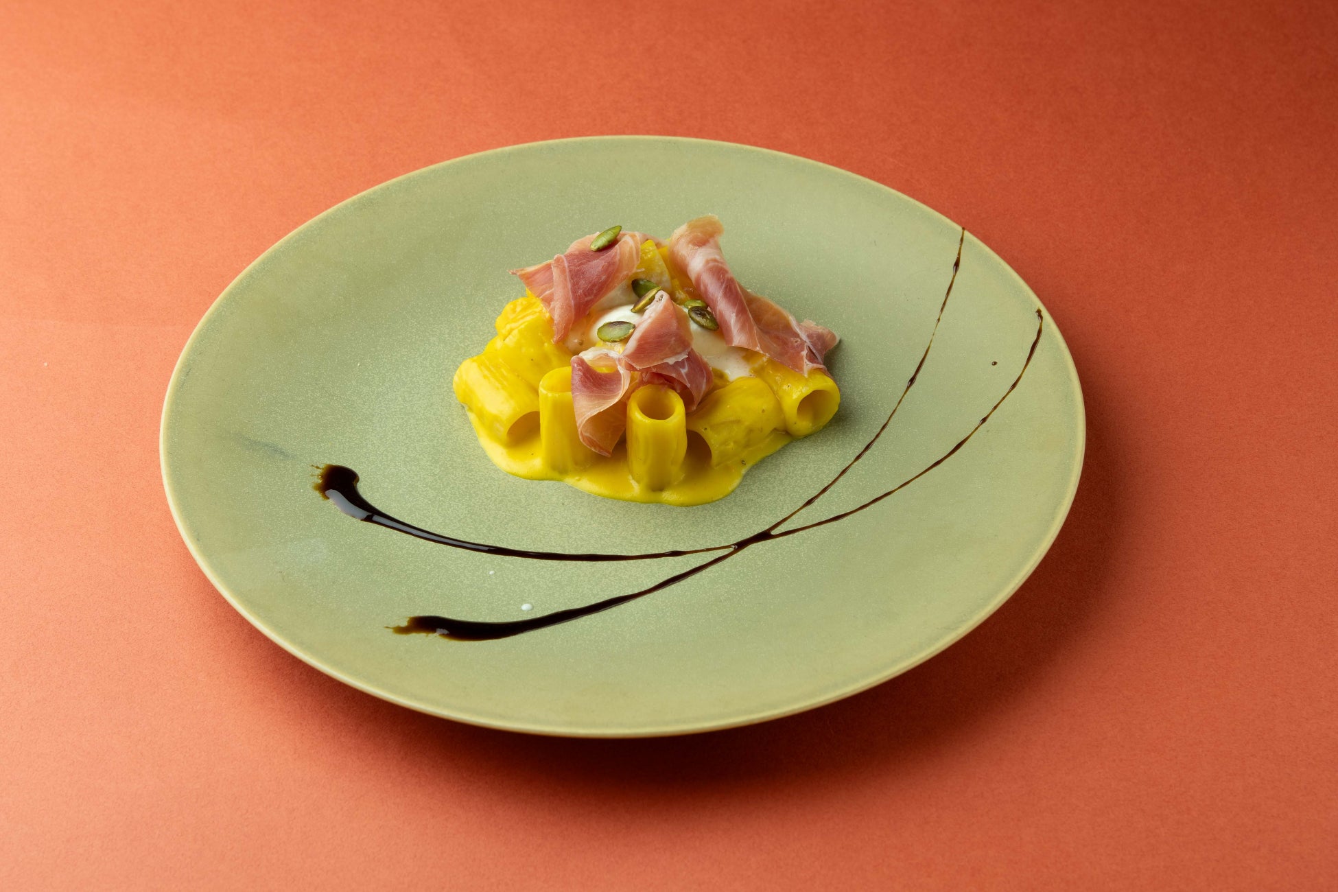 バターナッツ南瓜の豊潤な甘味を生ハムの塩味で締めた抜群のマリアージュ。ショートパスタ“リガトーニメッツェ”と共に。