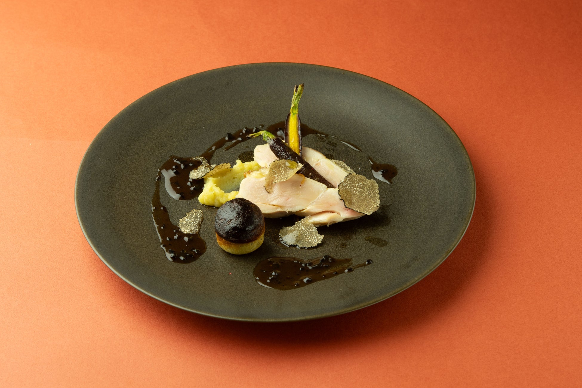旨味たっぷりな、はかた地鶏のサルタート(ソテー)。黒トリュフの豊かな香りをお楽しみください。
