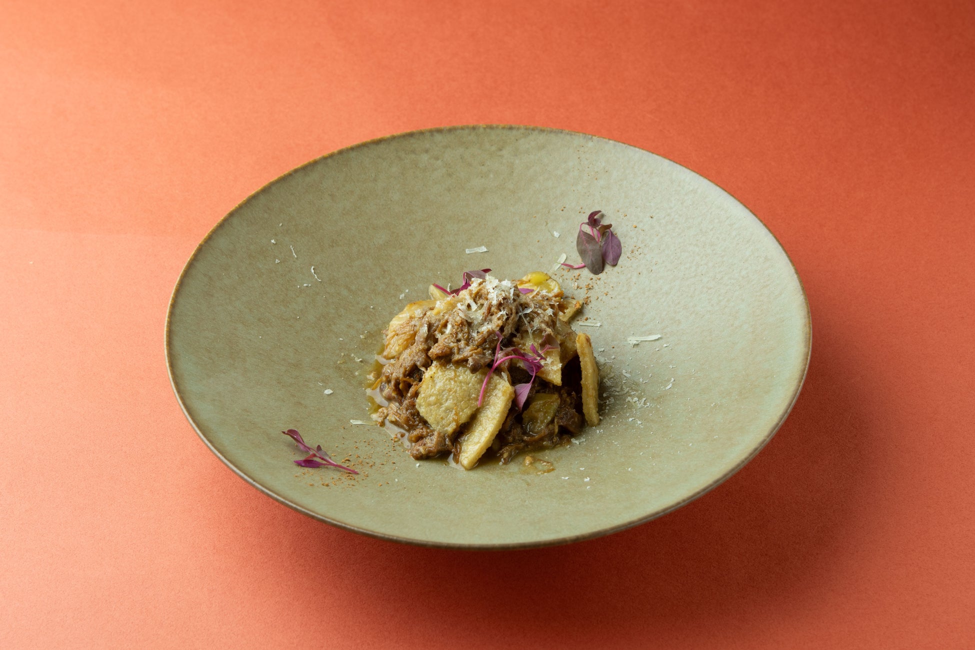 パスタの起源と呼ばれる“テスタローリ”を、あいち鴨とイタリア栗の濃厚な煮込みソースで。