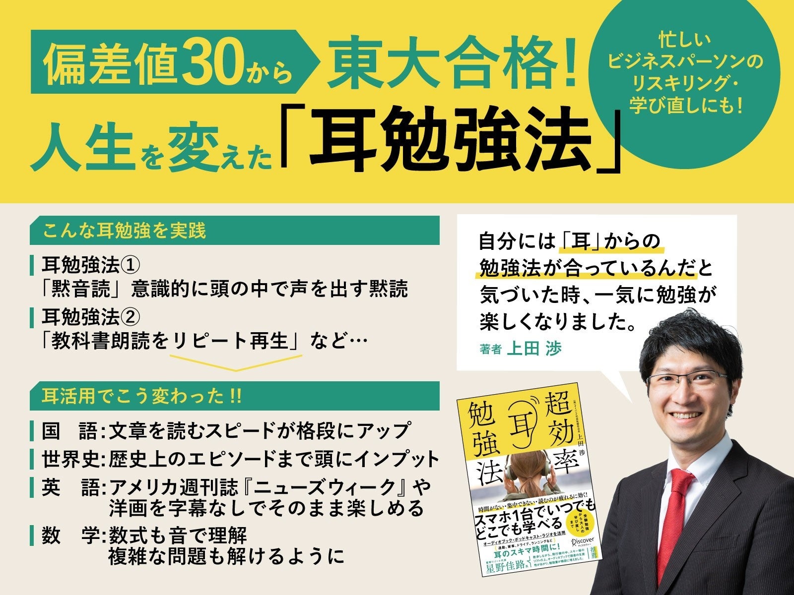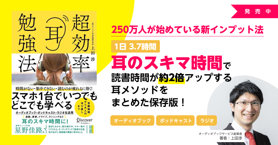 日本一のオーディオブック書籍ラインナップ数(※)を配信する音声配信サービス「audiobook.jp」を運営する株式会社オトバンク(本社:東京都文京区、代表取締役社長:久保田裕也、以下「オトバンク」)の創業者であり、代表取締役会長の上田渉が、「耳」を使った新読書法をまとめた新刊『超効率耳勉強法』の書籍とオーディオブック版を7月22日(金)に同日発売いたします。