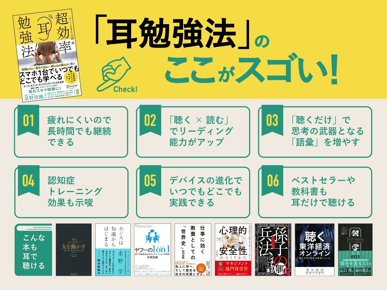 「学び直し」「リスキリング」等、生涯における「学び」の機会が増えている人生100年時代の現代。PCやスマートフォンなどで長時間酷使されている「目」に代わって、「耳」を活用した新たな勉強法が注目されています。その需要の高まりにあわせ、この度「耳勉強法」のエッセンスをまとめた教科書的1冊『超効率耳勉強法』を発売します。本書は、予約開始以降、Amazon「読書法」新着ランキングで1位を獲得するなど(※7月21日時点)大きな反響をいただいています。