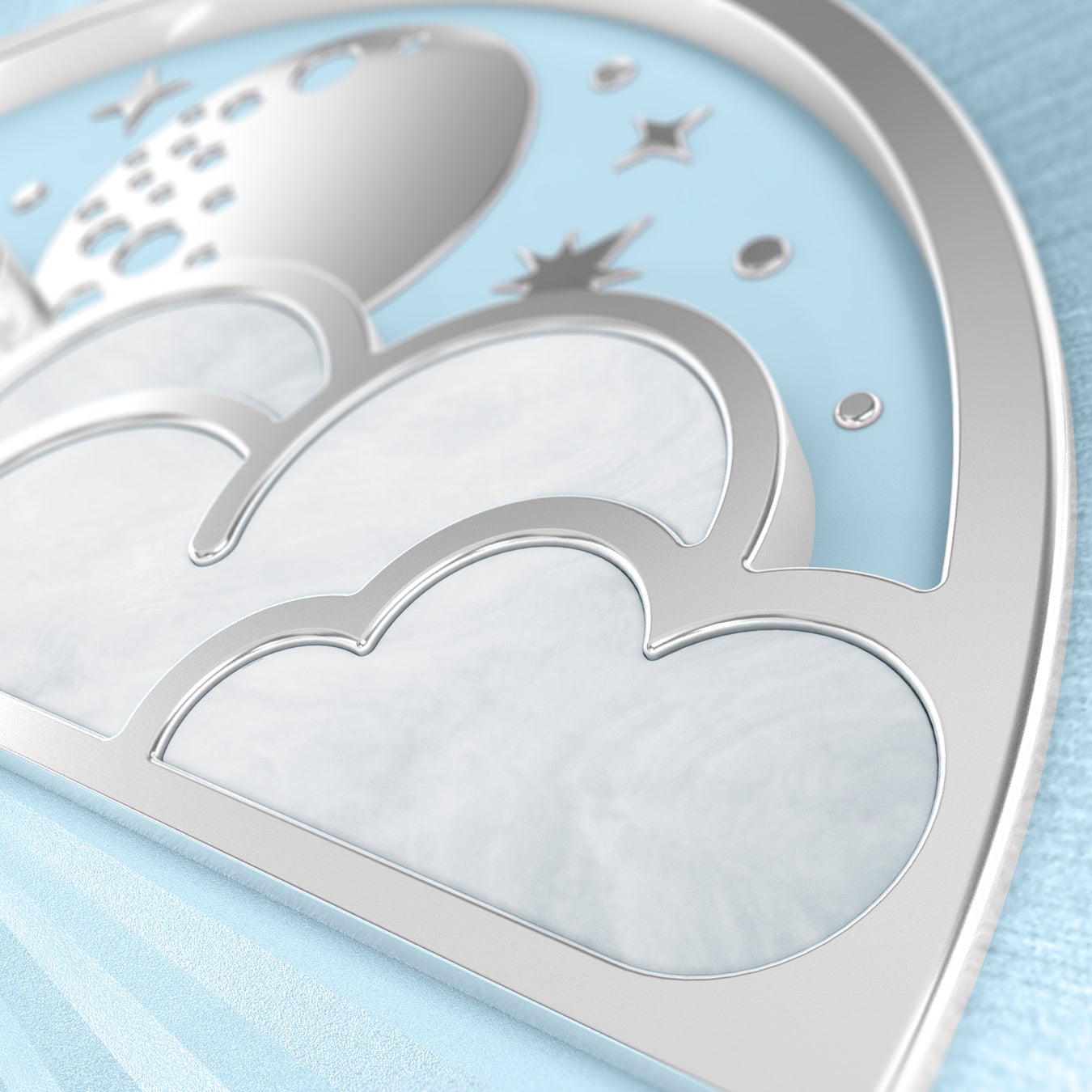 ムーンフェイズの窓を飾る雲は、本真珠のマザー・オブ・パールで装飾。