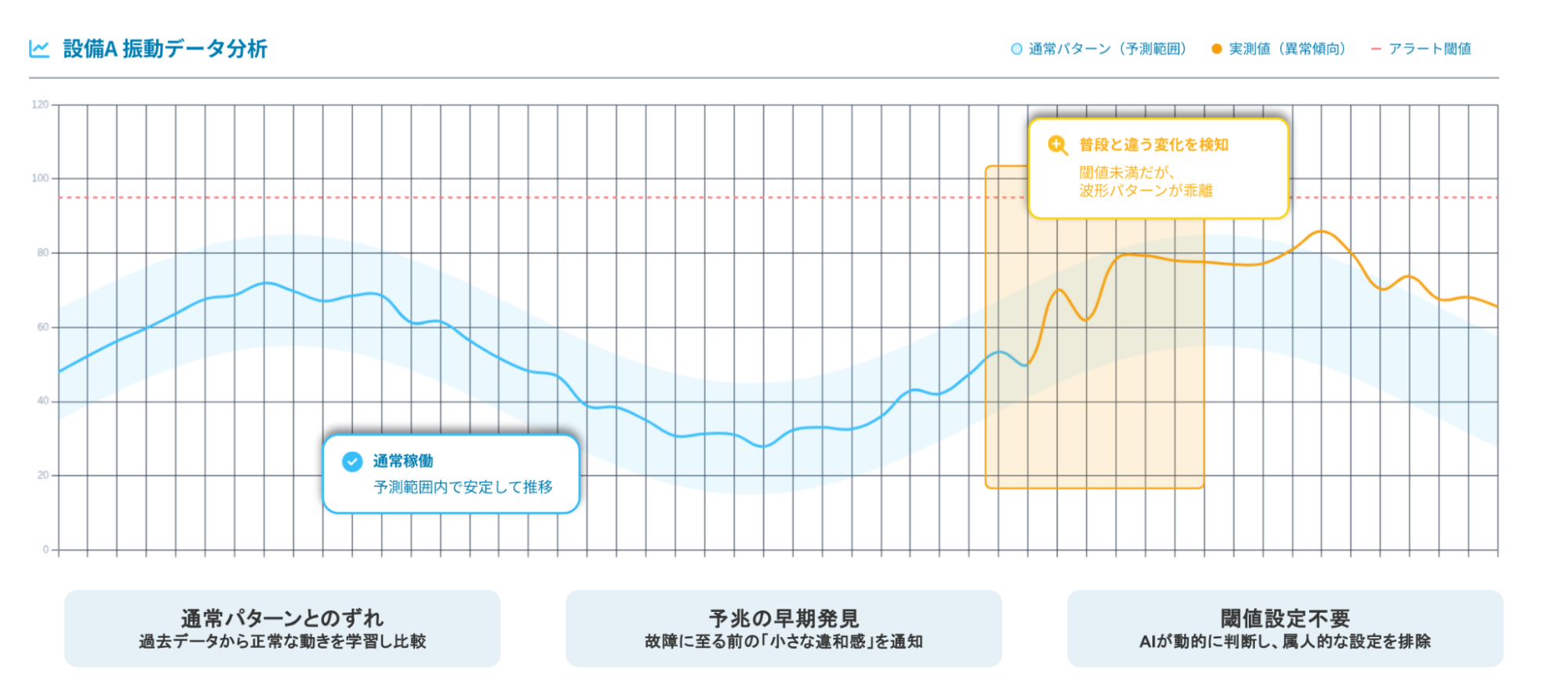 従来のようなしきい値ベースの監視では捉えられない微細な変化を検知し、異常の前段階での把握を可能にします。