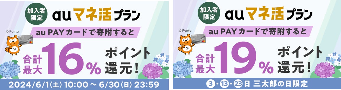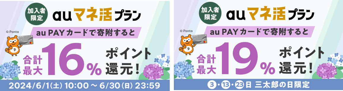 auマネ活プランに加入中のお客さまを対象に、キャンペーン期間中にエントリーのうえ、支払い方法で「au PAY カード」を選択し、au PAY ふるさと納税で10,000円以上寄附すると、au PAY カードでの寄附額に対して最大3%のPontaポイントを還元します。