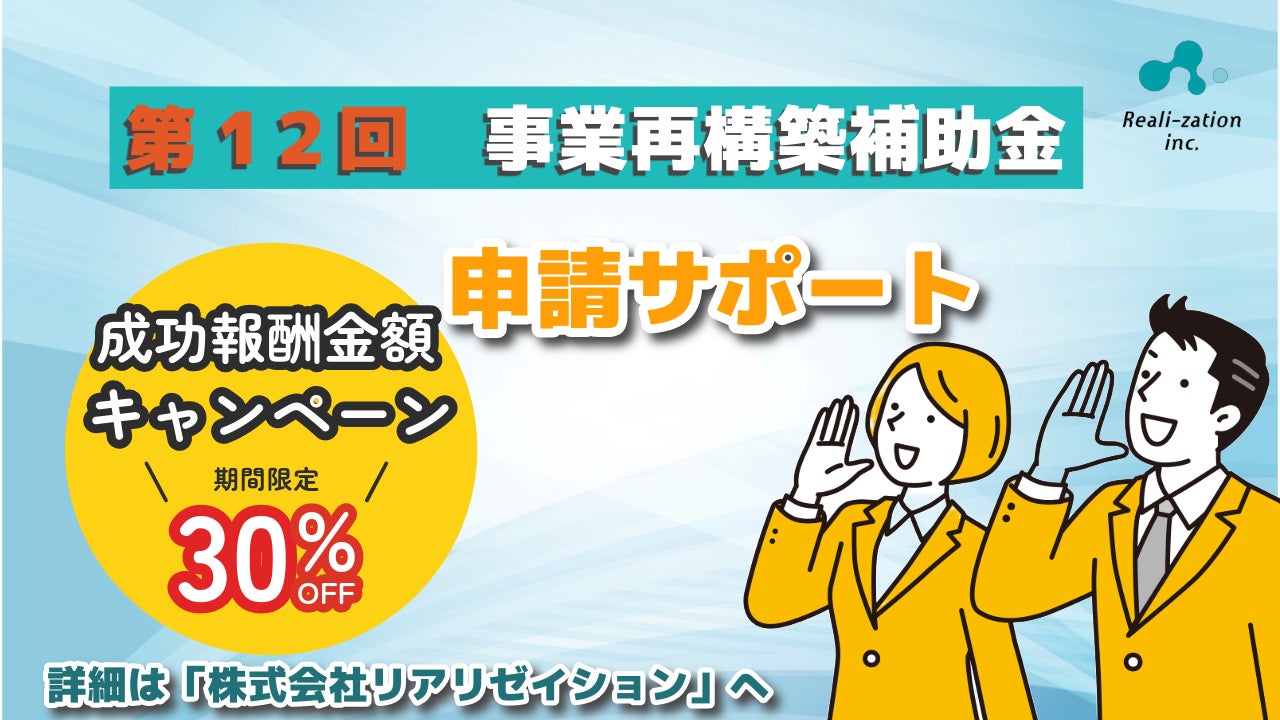 補助金の申請サポートを行うリアリゼイションは、「事業再構築補助金」(第12回)において、今回の公募に限り「成功報酬金額30%OFFキャンペーン」を実施いたします。