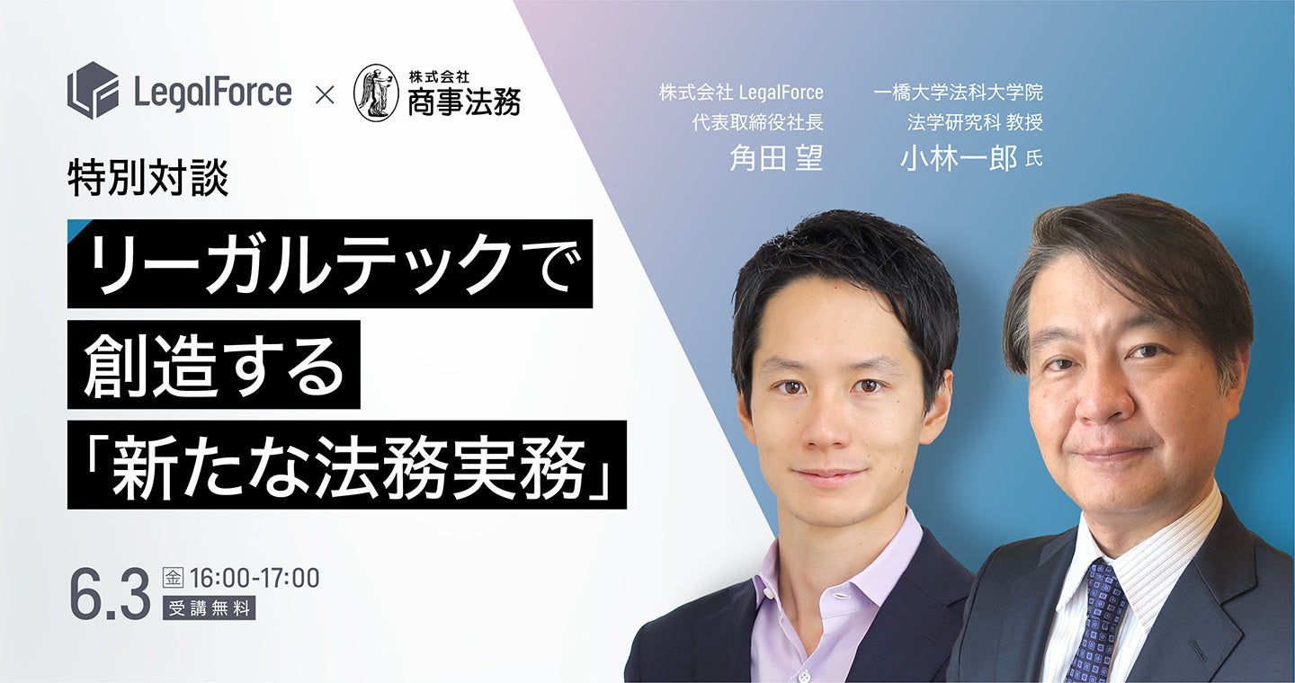 6/3(金)16:00〜一橋大学法科大学院教授 小林一郎氏×LegalForce代表取締役社長 角田望【特別対談】リーガルテックで創造する「新たな法務実務」オンラインセミナーを開催
