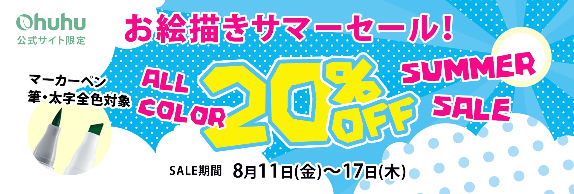 8月11日(金)~8月17日(木)の期間、筆・太字タイプのイラストマーカー全品20%OFFになるサマーセールを開催いたします。