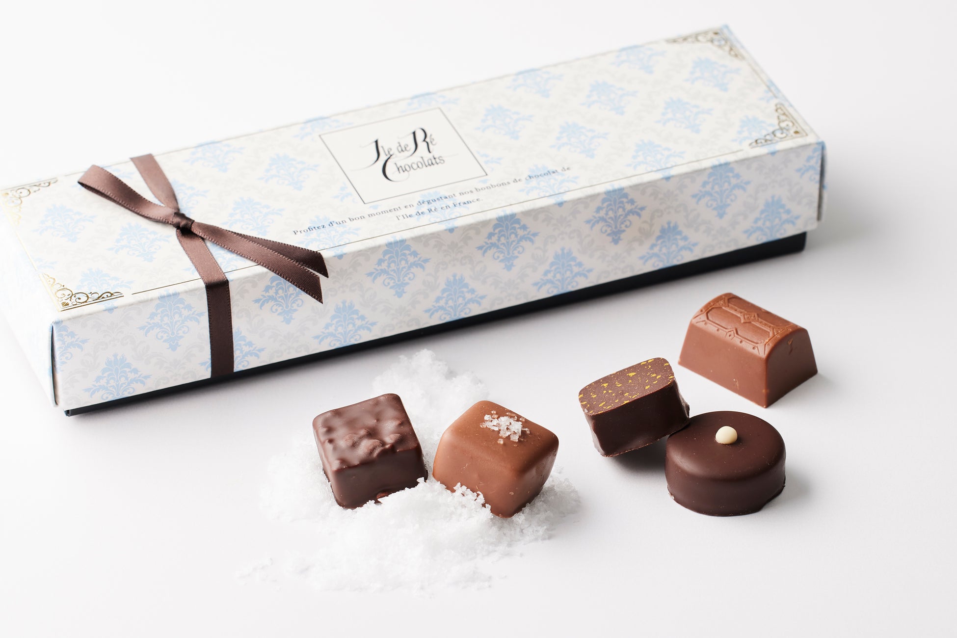 レ島名産のフルール・ド・セル(塩の花)や高品質なA.O.P認定バターなど、地元の素材を活かし丁寧に作られるショコラをお楽しみください。