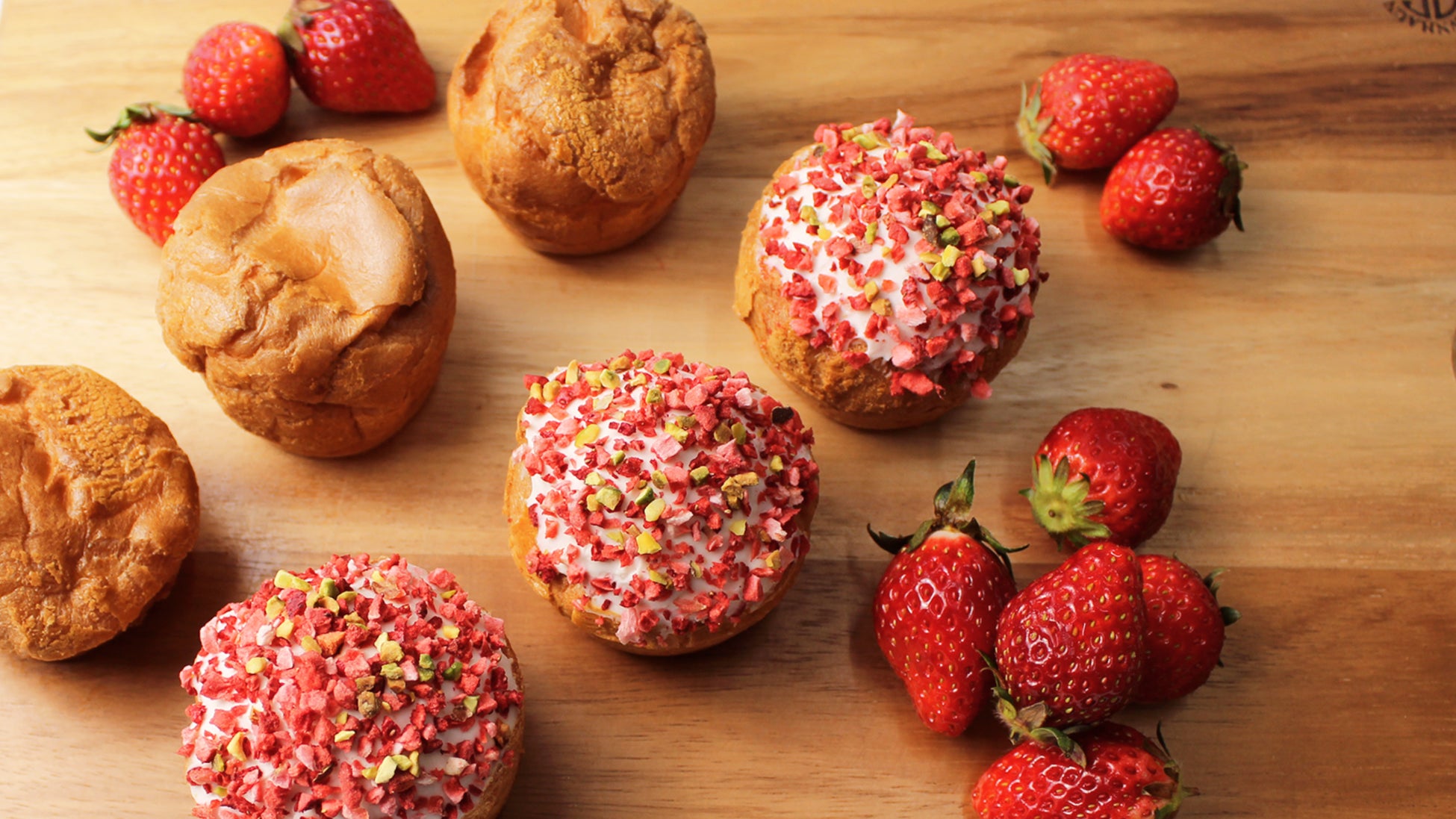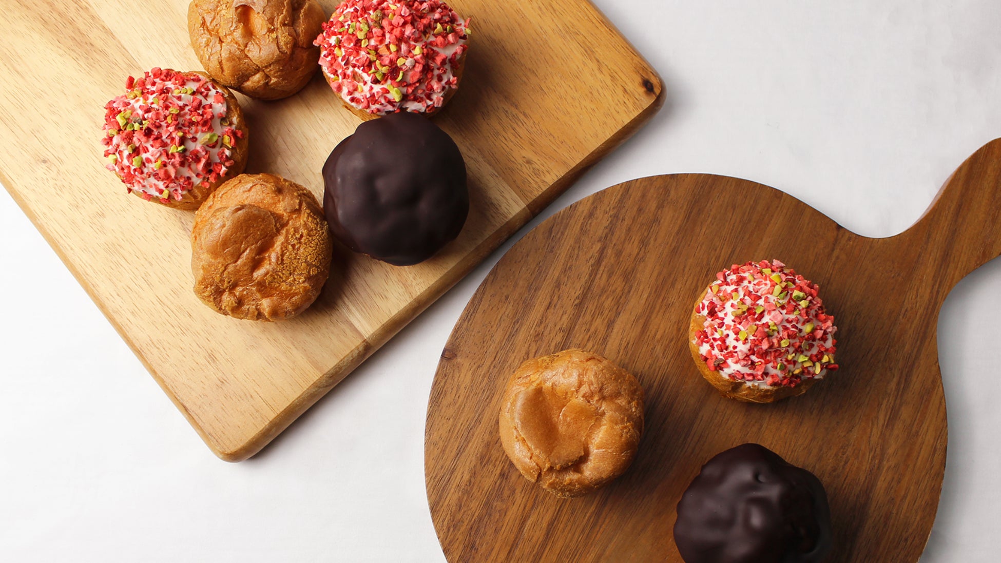 リセライーツで大人気の低糖質スイーツの「生はちみつシュークリーム」と再販売後即完売が続いている「エクレア」、さらに春季限定販売の「4層仕立ての苺シュー」の3種類セットです。