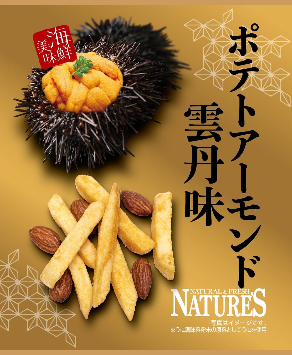 商品特徴:うに醤油シーズニングで味付けしたポテトスティックとアーモンドの