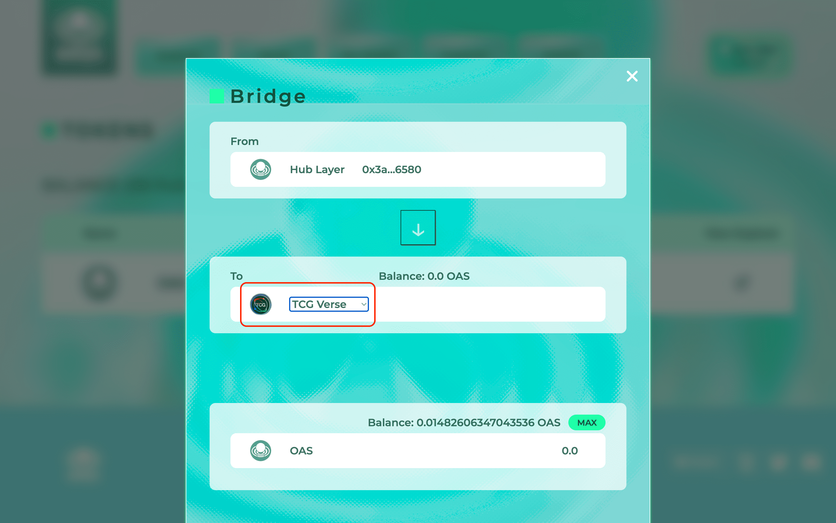 手順③TCG Verseを選択し、必要な量のOASをHub LayerからTCG Verseにブリッジ