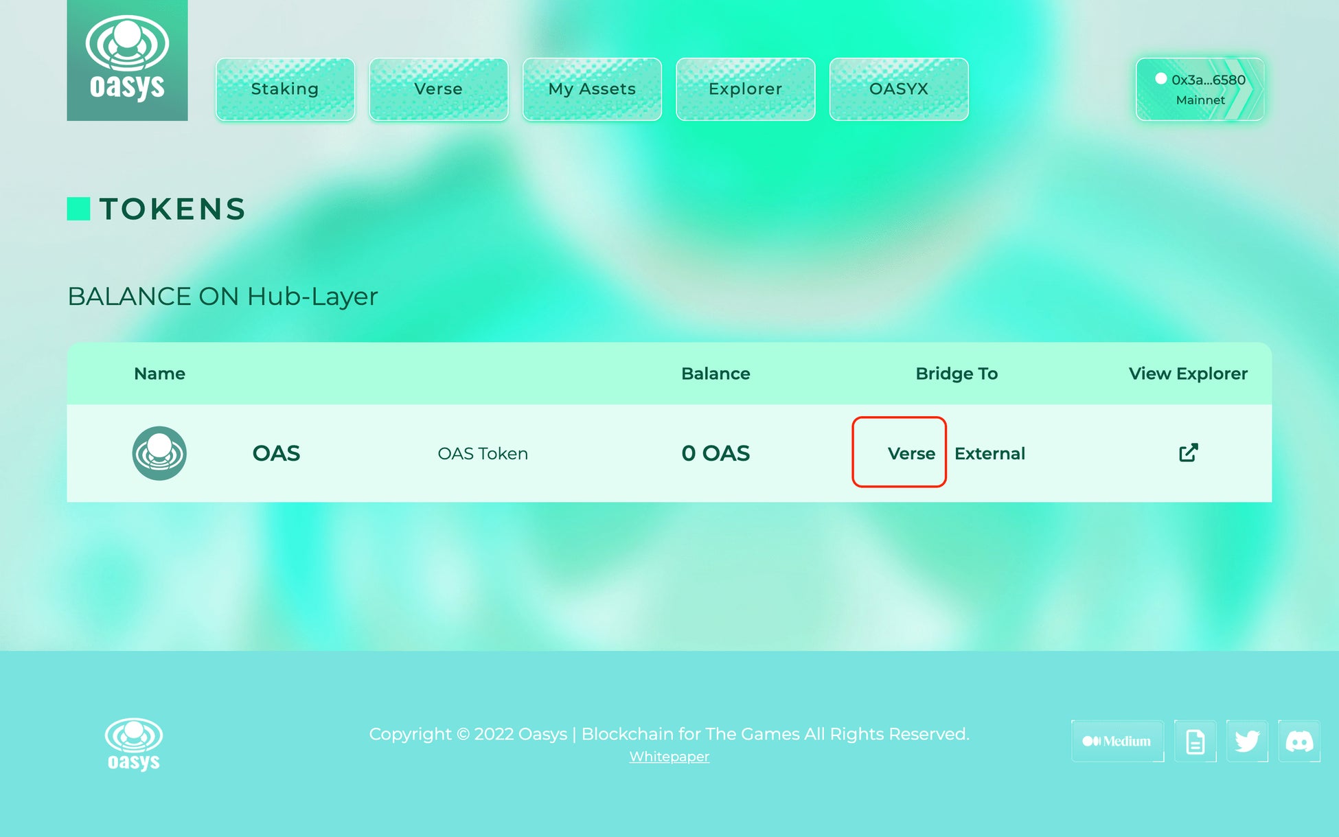 実際にNFTを購入して頂く前に、お持ちの$OASをOasys HubのMy AssetsでHub LayerからTCG Verseにブリッジして頂く必要がございます。