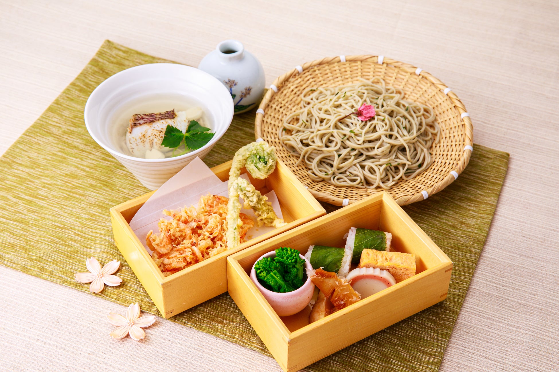 桜の葉を練り込んだお蕎麦は噛むと口の中に桜の香りが広がります。香ばしい桜エビのかき揚げに春の山菜天ぷら、風味の良い桜鯛のお吸い物蕎麦など桜づくしの御膳。春を感じながらお楽しみ下さい。