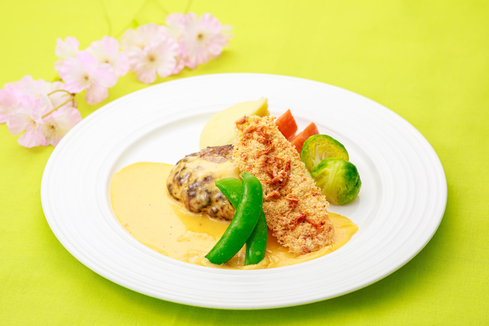 当店自慢のハンバーグに合わせた海老のクリームソースに、さくら海老とチーズで作ったガレットを添え、香ばしい食感をお楽しみいただけます。※各日15食限定