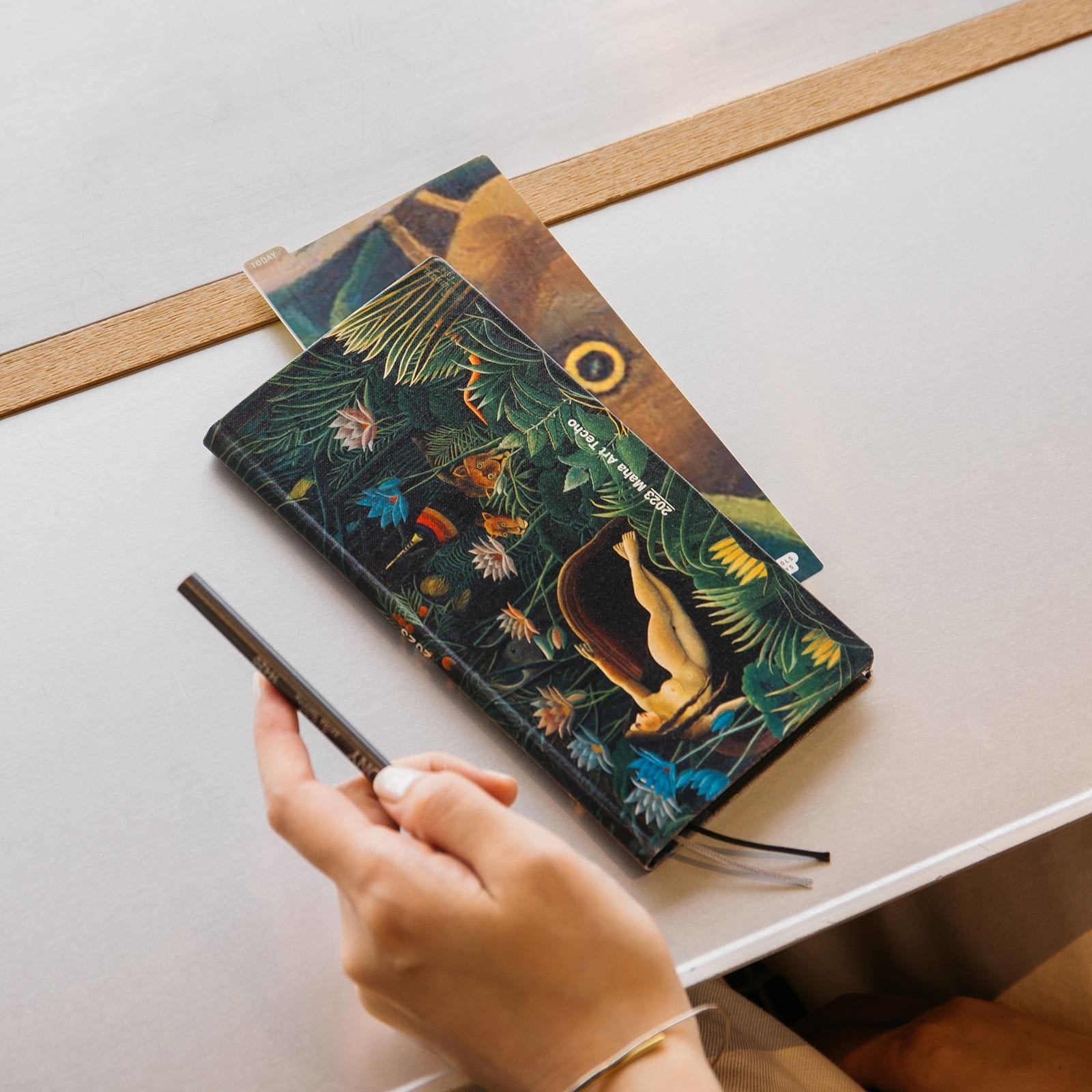 小説家の原田マハさんと、アートをもっと気軽にたのしむための「ほぼ日手帳 weeks」(週間手帳、以下「weeks」)をつくりました。表紙は、マハさんの著書にも登場する、アンリ・ルソーの『夢』。下敷きもセットでついてきます。通常版にはない、マハさんが書き下ろした16ページの特別ページを収録。マハさん流の美術館のたのしみ方を紹介する「ミュゼ活5か条」や、全国各地のおすすめ美術館を季節にあわせて訪れるエッセイ「原田マハの推しミュゼ」など、“読む手帳”としても堪能できます。見たアートや訪れた美術館のことを記録する「ミュゼ活手帳」としてたのしむのもおすすめです。