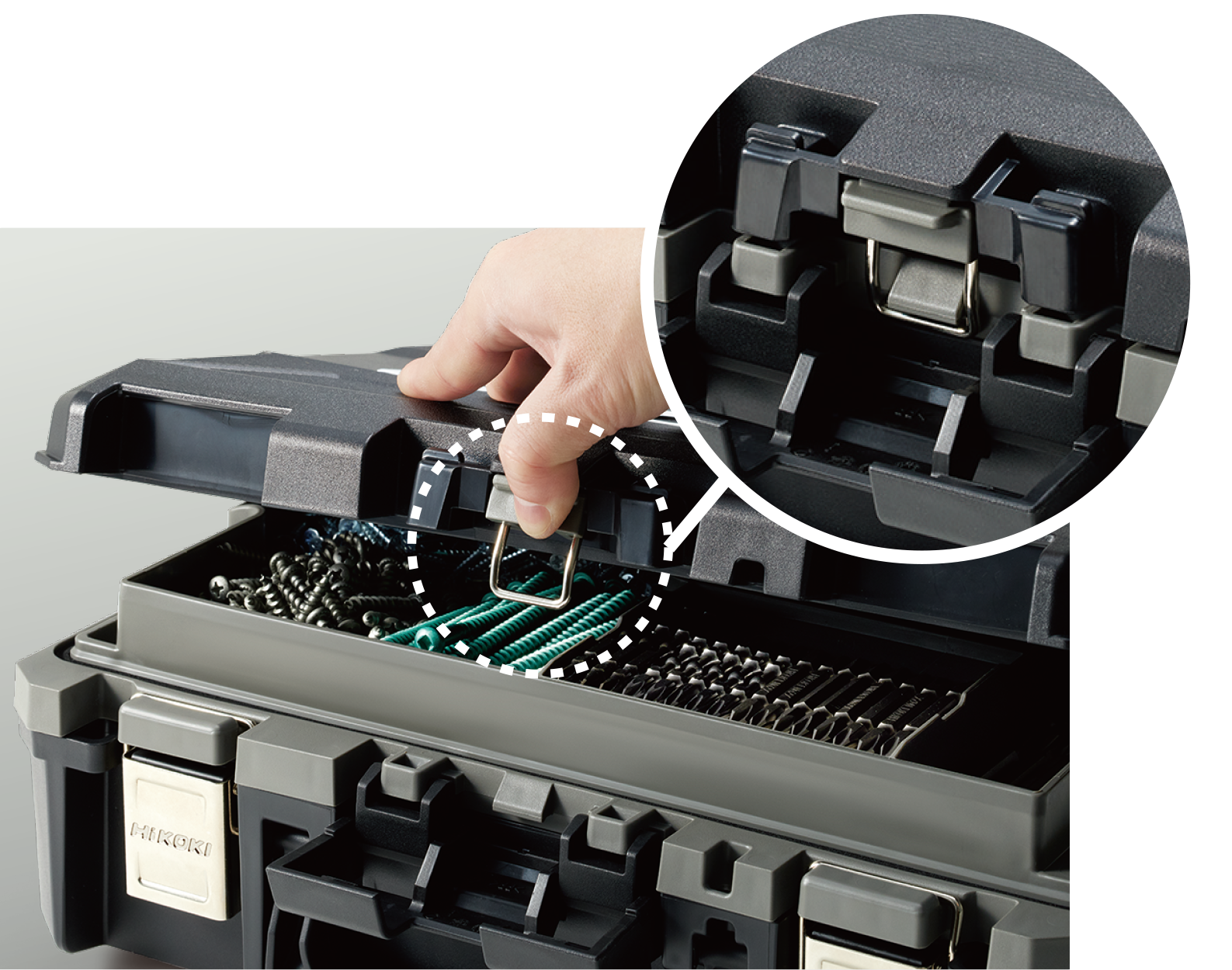 小物入れのフタを閉じると自動で簡易ロックし、ラッチの閉め忘れによる小物のバラまきを防止。また、側面に 手をかける溝を設け、側面からの引き出しが可能になりました。さらに、 IP65相当の防じん耐水性を兼ね備え、ちりやほこり・水の侵入を防止します。
