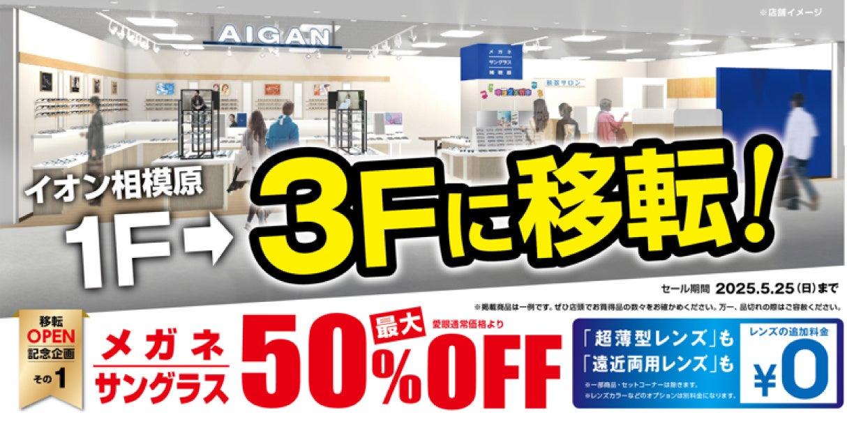 メガネ・補聴器を販売する「メガネの愛眼」「Aigan」 (https://www.aigan.co.jp/)を運営する愛眼株式会社(本社:大阪市天王寺区、代表取締役社長:佐々 昌俊)は、神奈川県相模原市の商業施設「イオン相模原店」3Fに「AIGAN イオン相模原店」を2025年3月14日(金)、移転リニューアルオープンしましたことをお知らせいたします。