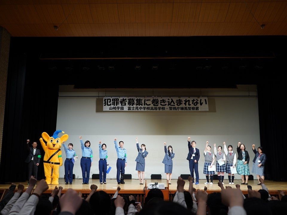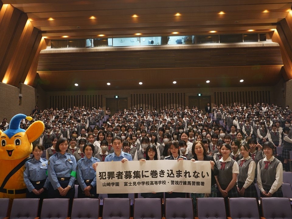 この度、黒見明香(乃木坂46)・佐藤綺星(AKB48)特別防犯支援官が東京都練馬区の富士見高校の防犯教室に登壇し、集まった生徒に対して、特殊詐欺・犯罪実行者募集(いわゆる「闇バイト」)に関する広報啓発を実施しました。