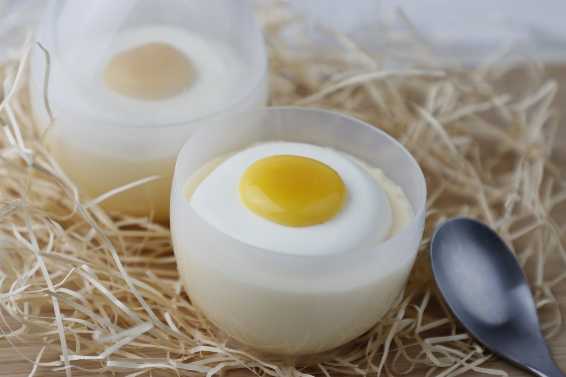目玉焼き風に仕上げた遊び心あふれる卵型容器入りのプリンです。
