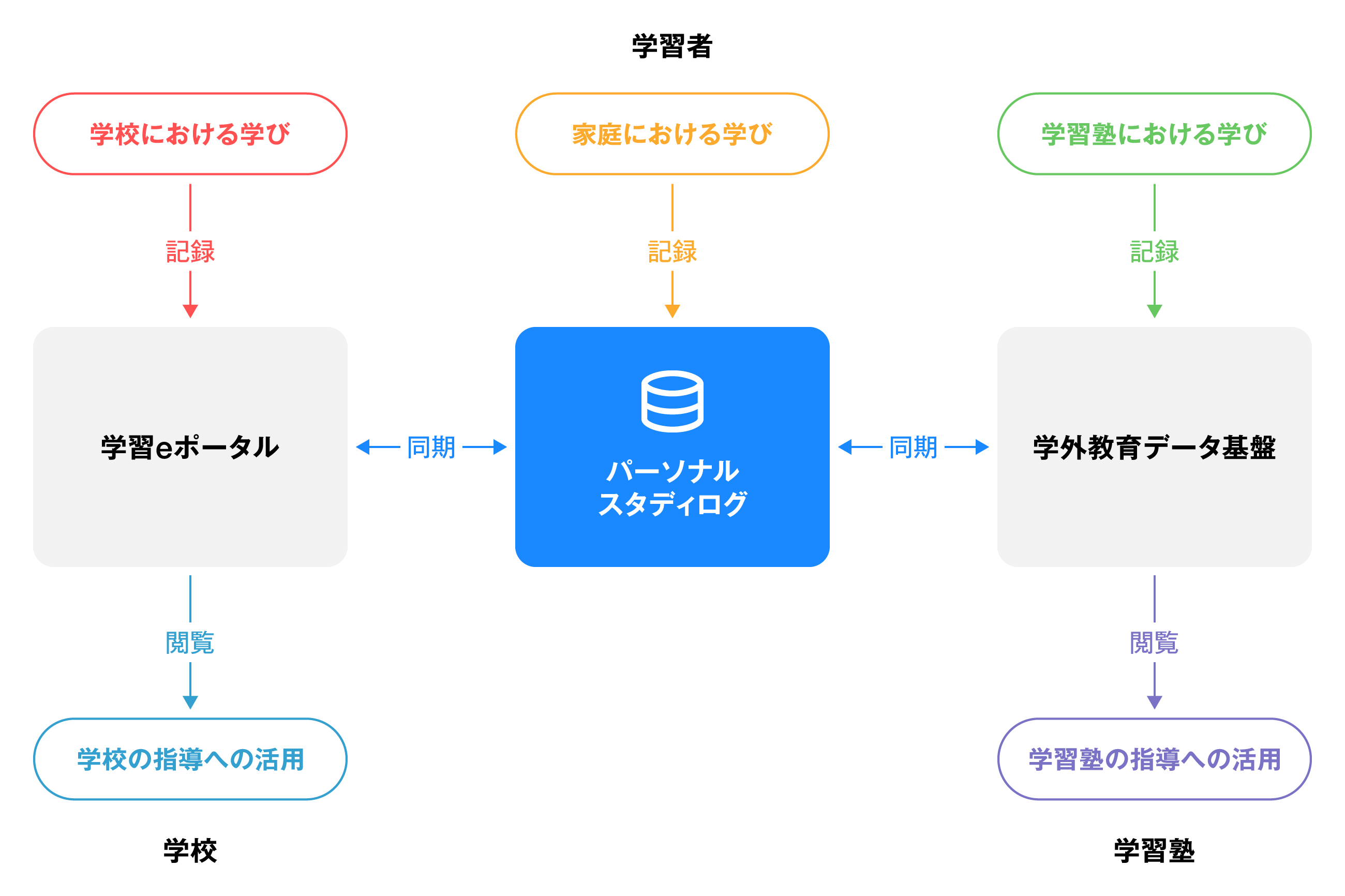 現在、学習者が学ぶ場所は家庭・学校・学習塾とさまざまであり、学習記録はそれぞれの場所に散在しています。