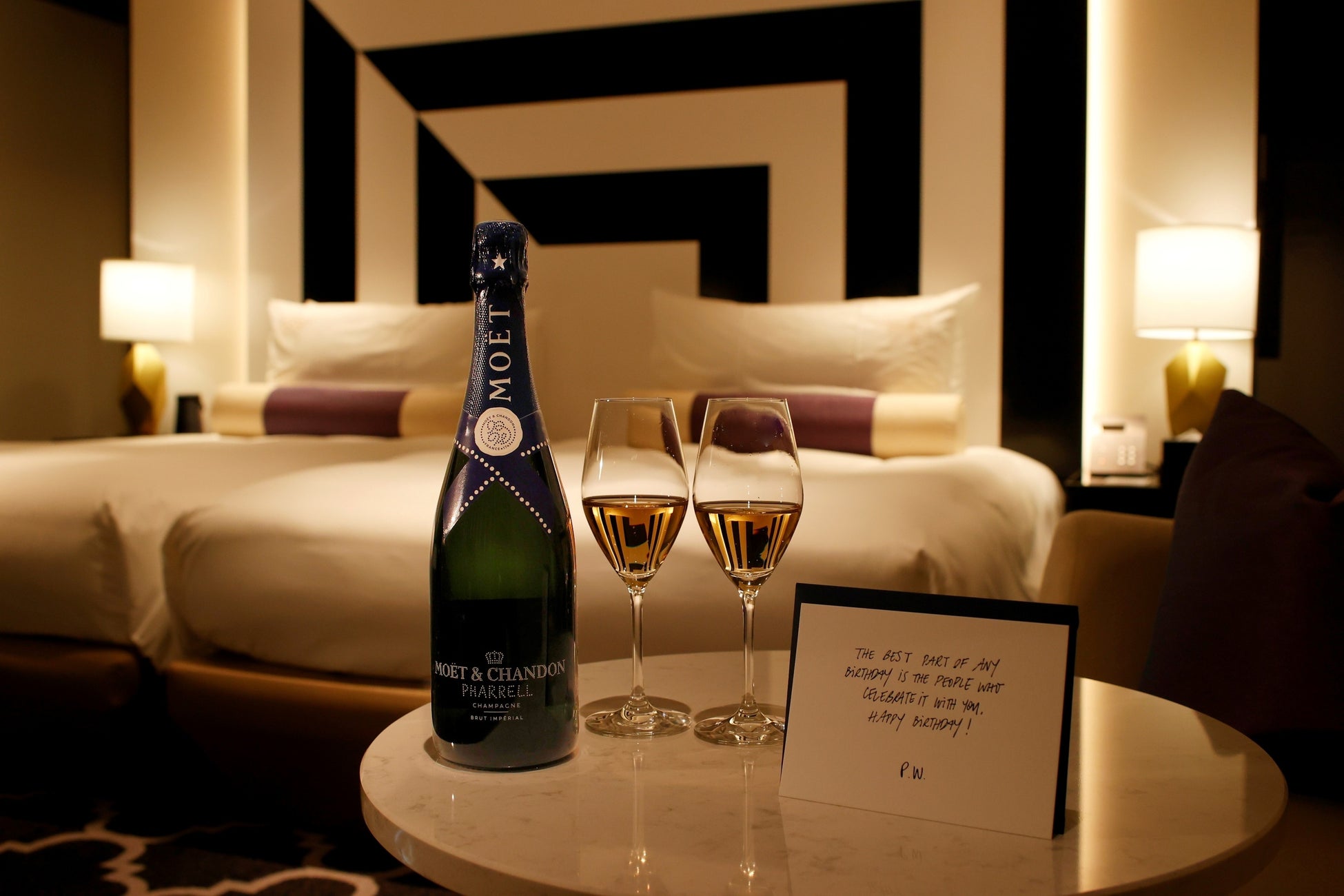 今回の宿泊パッケージでご用意するのは、ファレル ウィリアムス氏とモエ・エ・シャンドンのコラボレーションによってデザインされた限定ボトル「モエ アンペリアル ファレル ウィリアムス」。ファレル氏オリジナルのバースデーメッセージカードに、チェックインの際お撮りする記念写真を添えて、お部屋にお届けいたします。