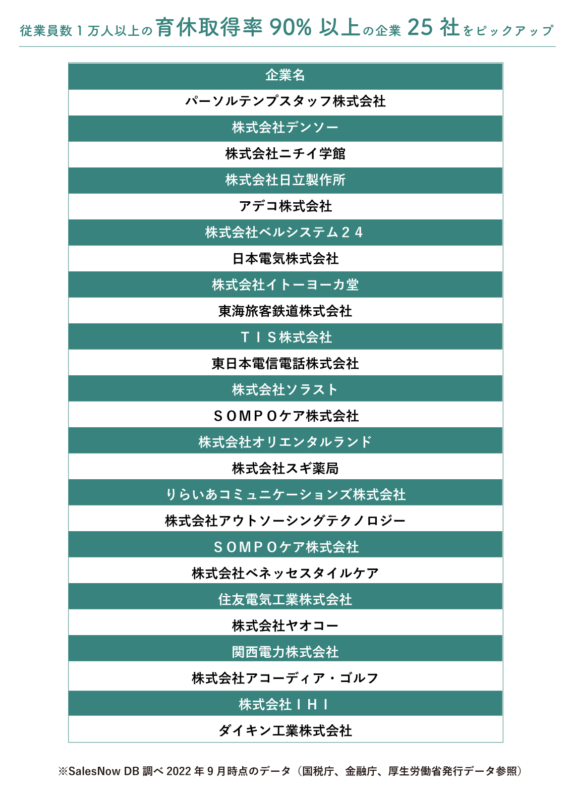 - 「従業員1万人以上の企業における育休取得率90%以上の企業25社」について