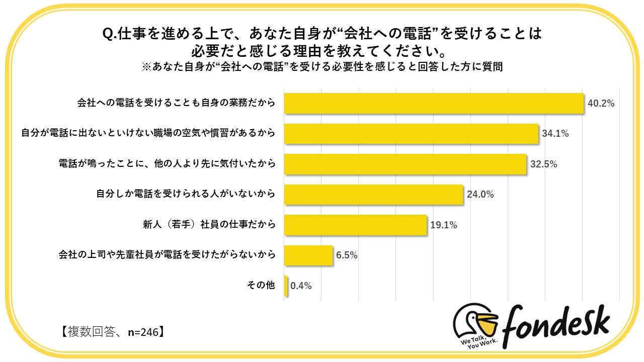 自身が会社への電話を受けることが必要だと感じる理由は、「会社への電話を受けることも自身の業務だから」が4割(40.2%)を超える結果に。
