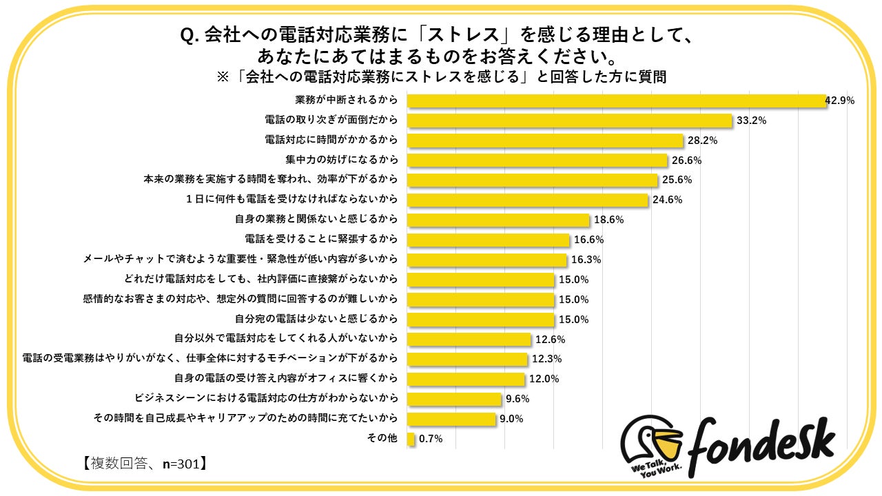 会社への電話業務にストレスを感じる理由は「業務が中断されるから」が4割以上(42.9%)と最も高い結果に。