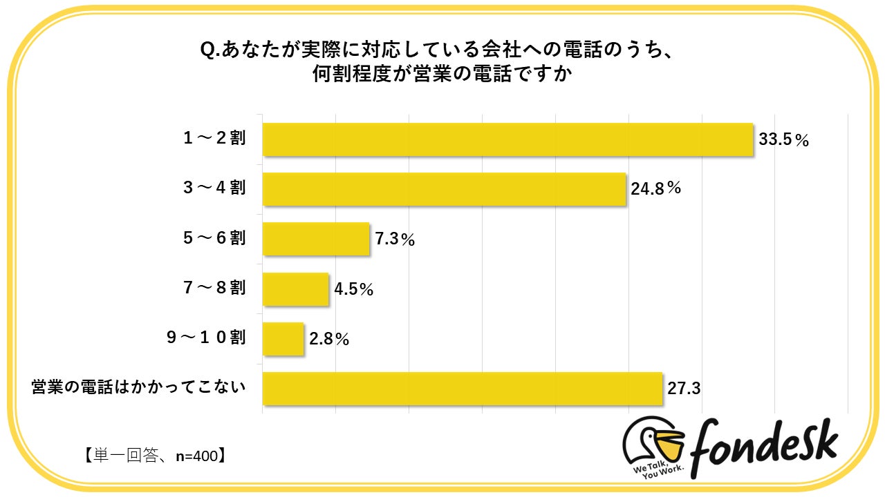 実際に対応している会社への電話のうち、何割が営業の電話であるか聞いたところ、「1~2割」と回答した人が3割(33.5%)を超える結果となりました。
