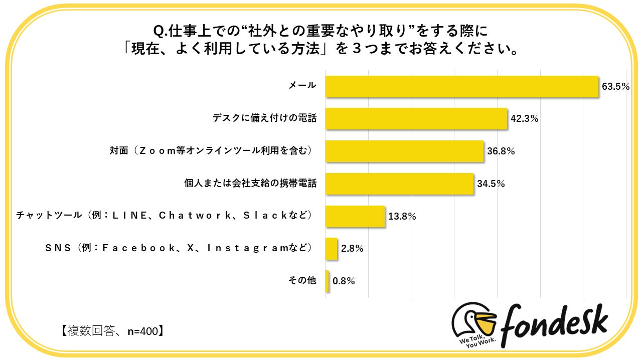 仕事上での“社外との重要なやり取り”をする際に「現在、よく利用している方法について質問したところ、「メール」が6割(63.5%)を超え、次いで「デスク備え付けの電話」(42.3%)という結果になりました。