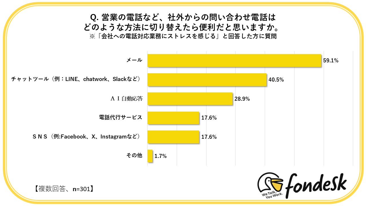 「会社への電話対応業務にストレスを感じる」と回答した方に、営業の電話など、社外からの問い合わせ電話はどのような方法に切り替えたら便利だと思うか質問したところ、「メール」が6割近く(59.1%)にのぼりました。次いで4割(40.5%)がLINE、chatwork、Slackなどの「チャットツール」を選択しており、テキストベースでのやり取りが上位を占めました。
