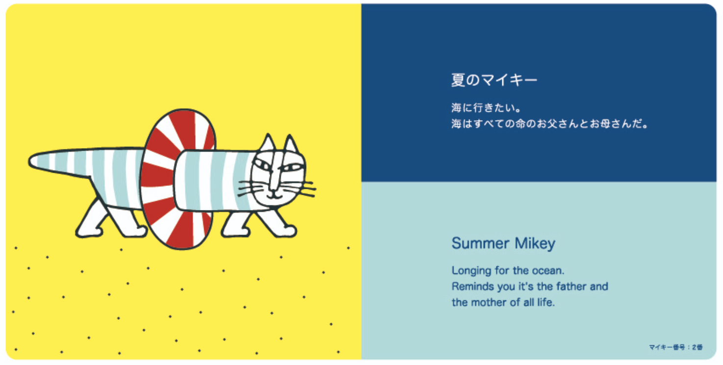 まるで現実の猫のように、マイキーには様々なヴァリエーションが存在します。今では、あらゆる自然や現象、私たちの想像力の届く場所には、そこに寄り添い、それを守るマイキーがいます。そんな、どんどん拡大していくマイキーの世界を初めて1冊の本としてまとめたシリーズ第一弾が登場しました。