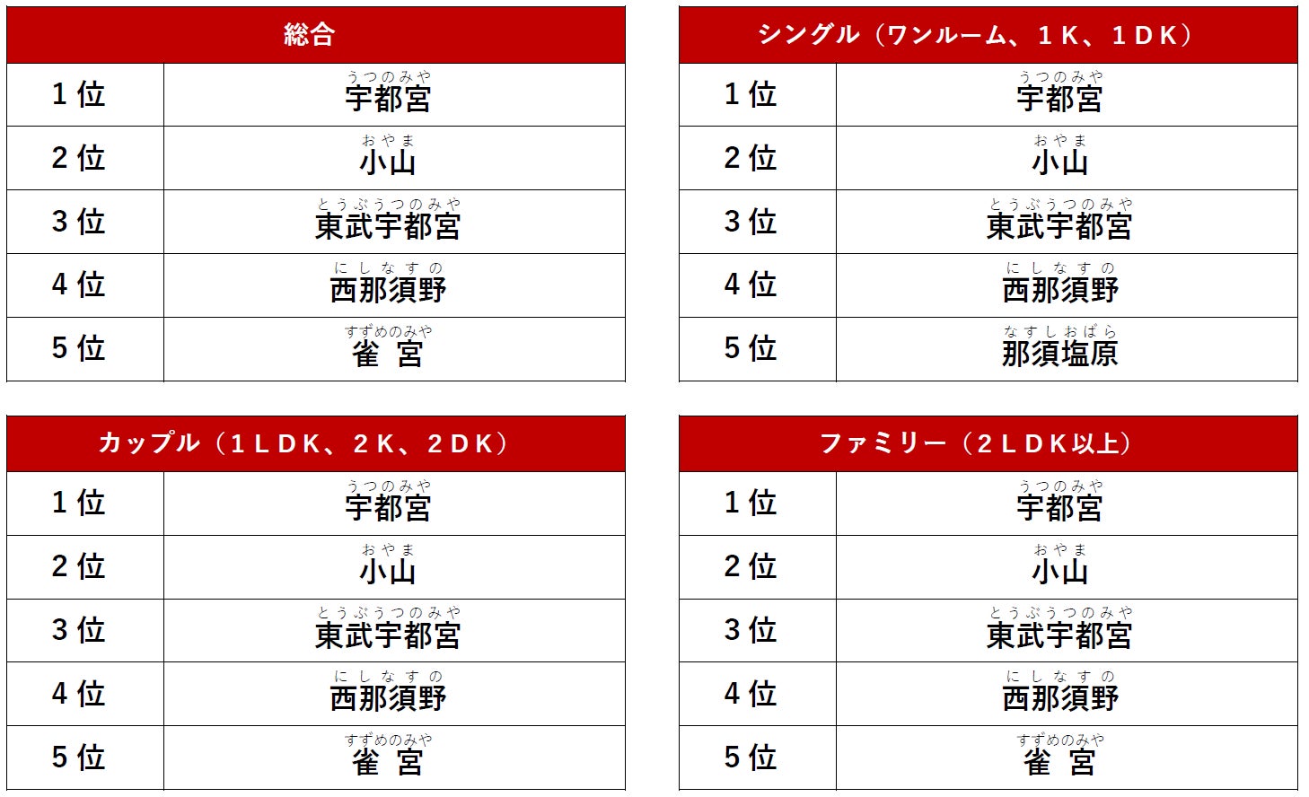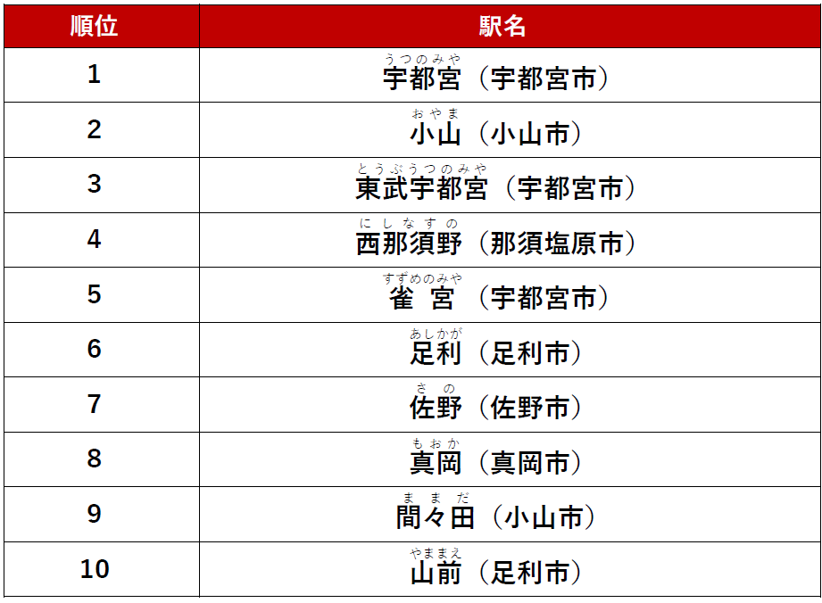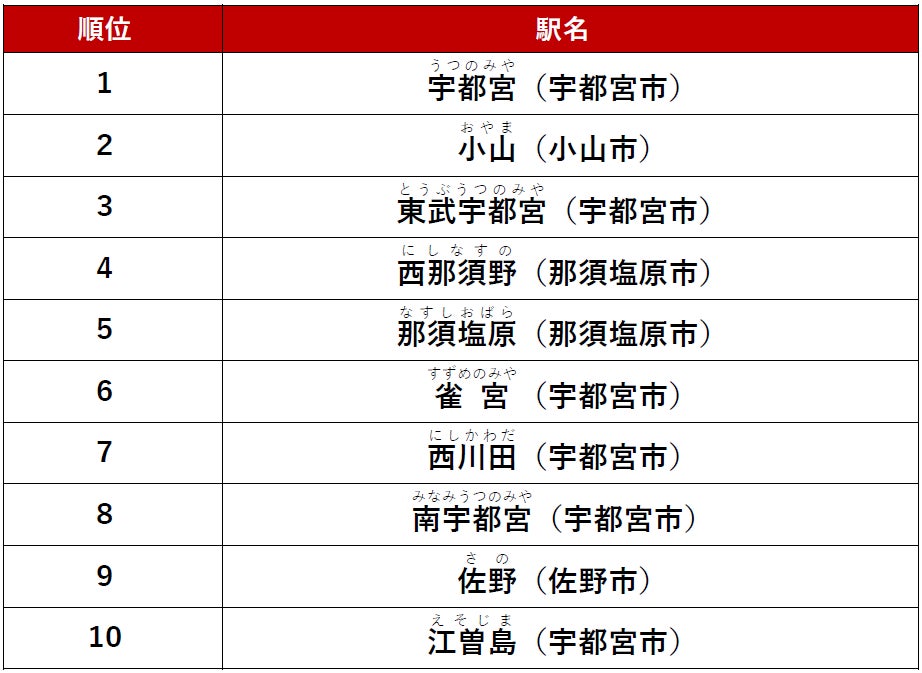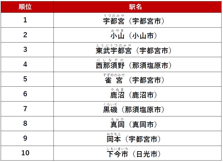 不動産情報サービスのアットホーム株式会社(本社:東京都大田区 代表取締役社長:鶴森 康史 以下、アットホーム)は、「不動産情報サイト アットホーム」で賃貸居住用物件において、アクセス数が多い人気の駅をまとめた「アットホーム人気の駅ランキング 栃木県編」を発表します。