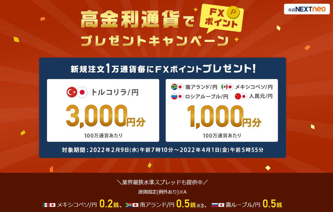 株式会社外為どっとコム(本社:東京都港区、代表取締役社長:竹内 淳)は、店頭FX『外貨ネクストネオ』にて、対象通貨ペアごとの取引数量に応じてFXポイントをプレゼントするキャンペーンを2022年2月9日(水)より実施します。高金利通貨ペアをもっと身近に感じてもらうために、新規注文1万通貨毎に所定のFXポイントをプレゼントさせていただきます。