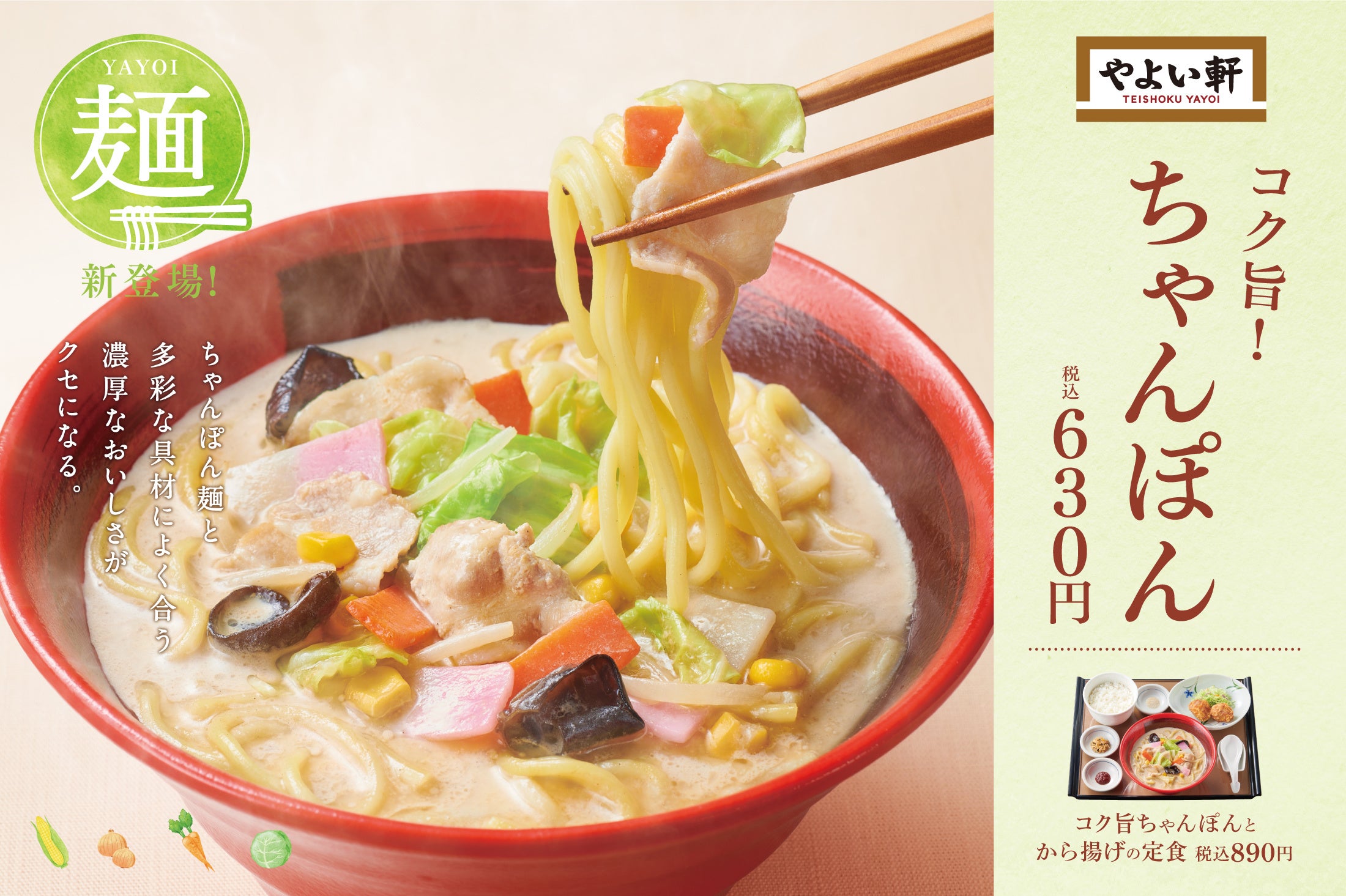株式会社プレナスは、定食レストラン「やよい軒」を、2022年2月末現在371店舗展開しております。このたび「やよい軒」では、豚・鶏の白湯ガラスープにモチモチ食感の麺がたまらない『コク旨ちゃんぽん(単品)』630円と、ちゃんぽんとから揚げを組み合わせた『コク旨ちゃんぽんとから揚げの定食』890円を、3月18日(金)より新発売いたします。また同日より、おうち定食の『[テイクアウト] コク旨ちゃんぽん』630円も併せて販売いたします。