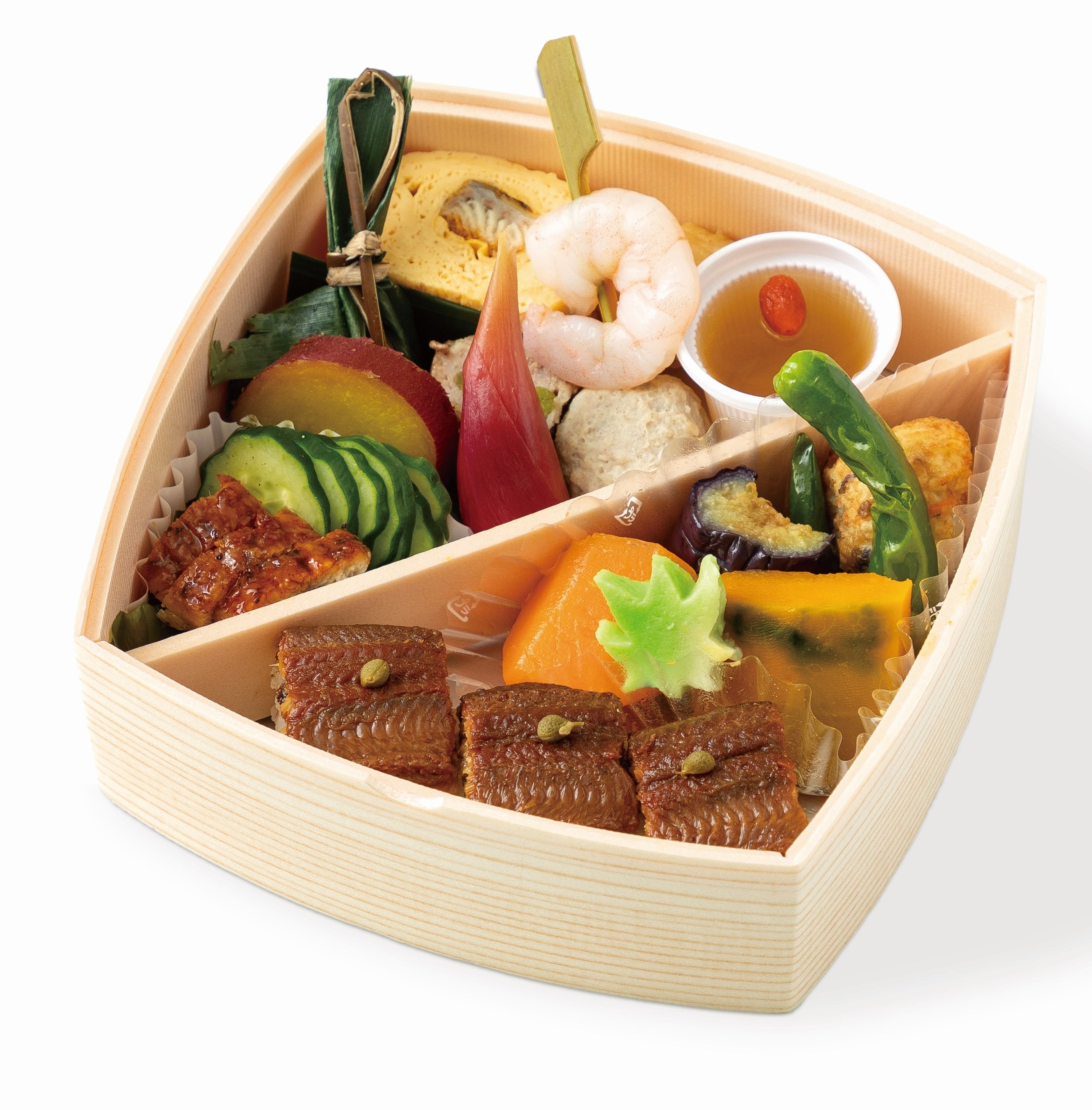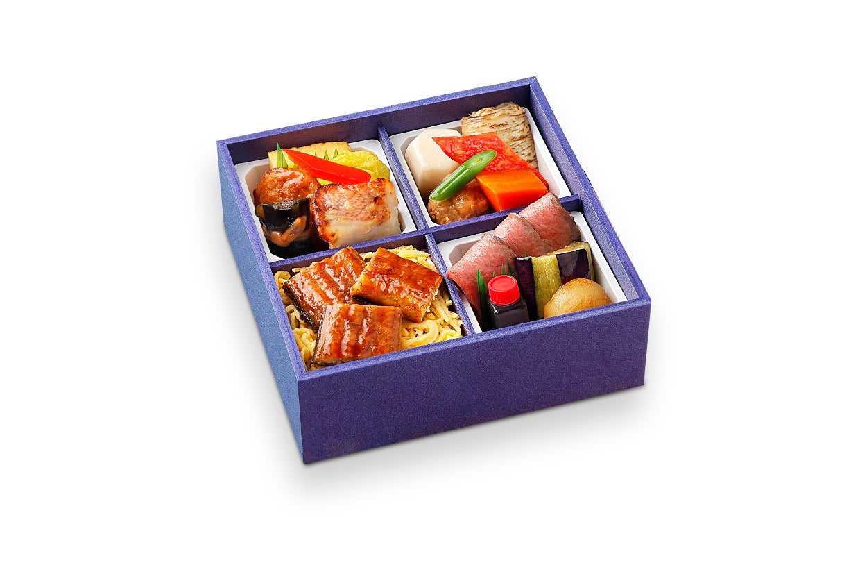 高知県産四万十ウナギの蒲焼をのせたご飯のほか、ローストビーフや煮物をバランスよく詰めました。