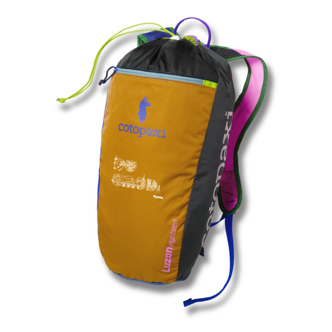 ドローストリング開閉式で、デイリー使いにぴったりなLuzon 18L Backpackに、京都店限定のステッカーロゴをプリント。軽量ながら丈夫なリップストップナイロンを使用しており、冒険の心強いお供になること間違いなし。くるくると折りたためば、旅行のサブバッグとしても便利です。