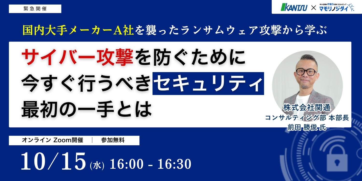 【10/15(水)16:00-16:30 緊急開催】国内大手メーカーA社を襲ったランサム攻撃 。サイバー攻撃を防ぐために今すぐ行うべきセキュリティ最初の一手とは | 関通×マモリノジダイ 共催セミナー