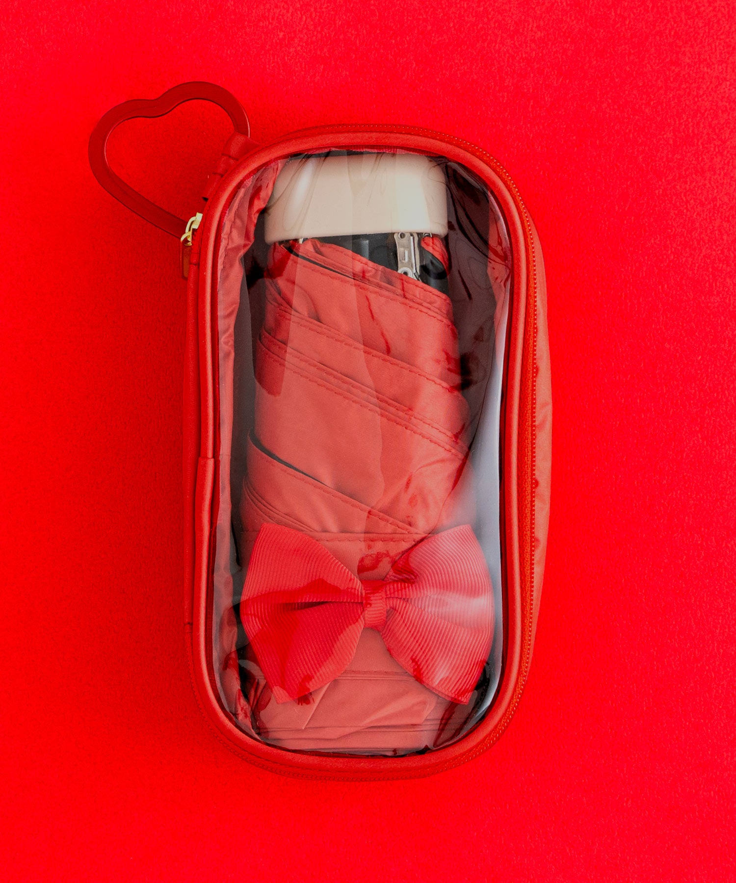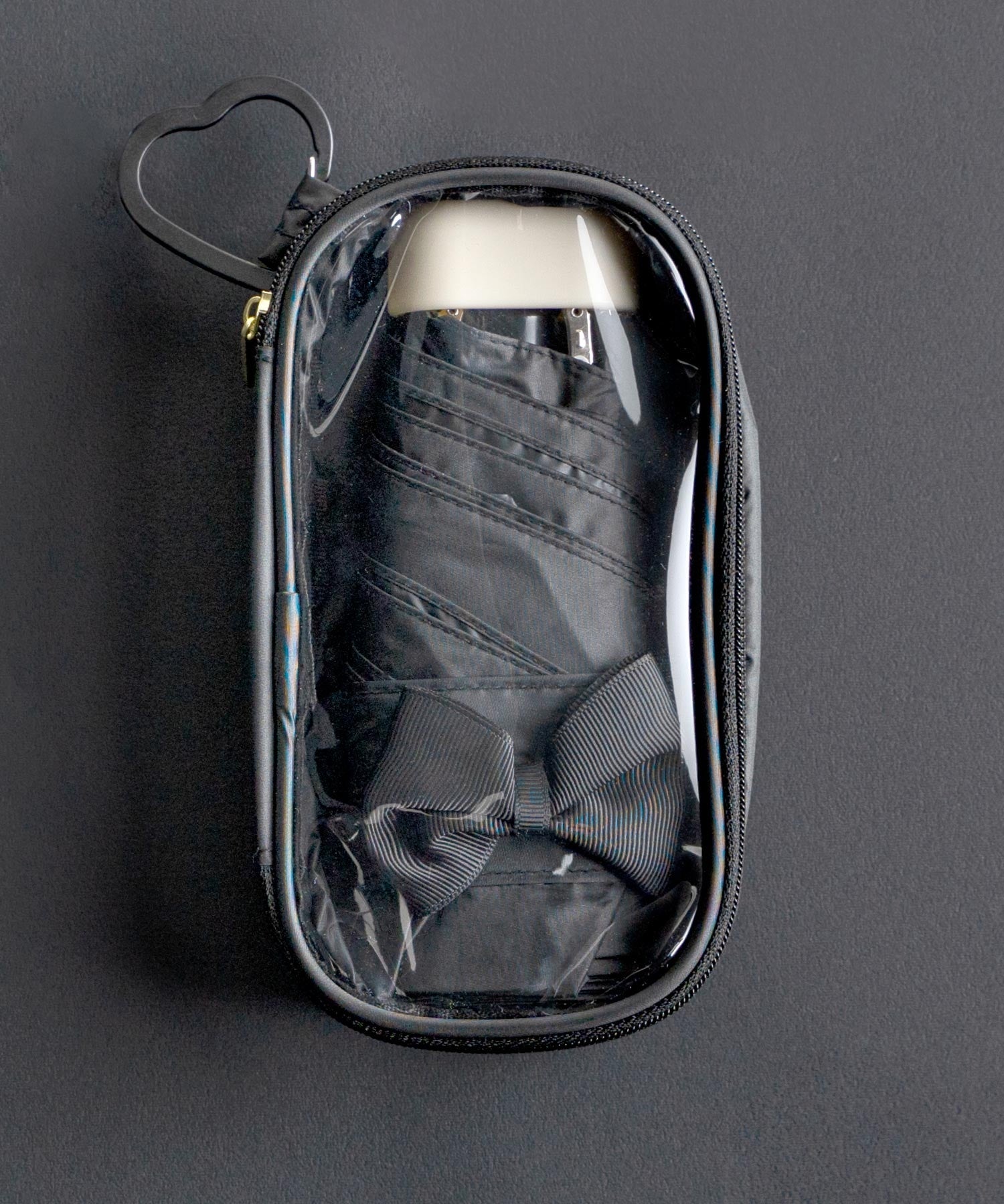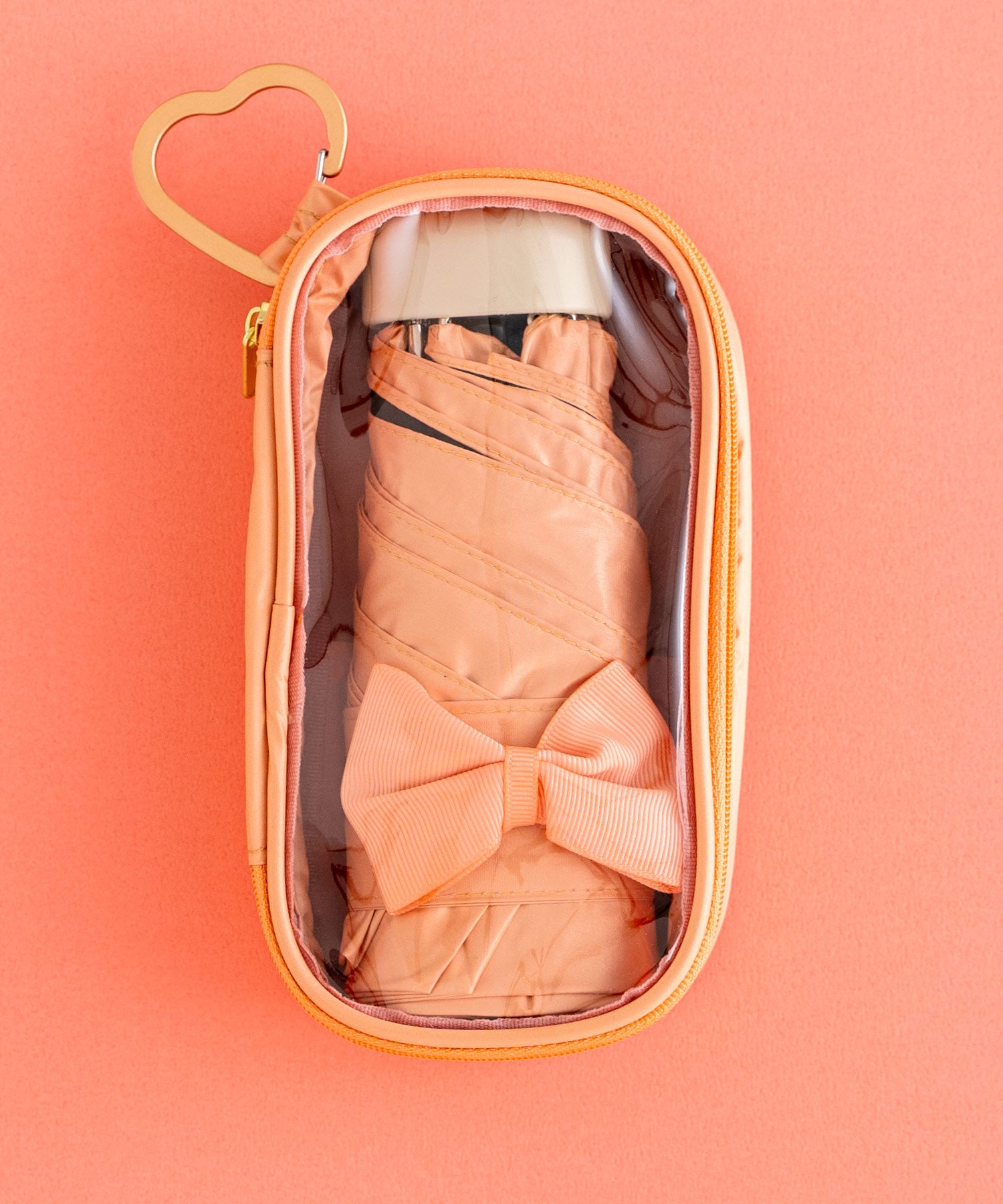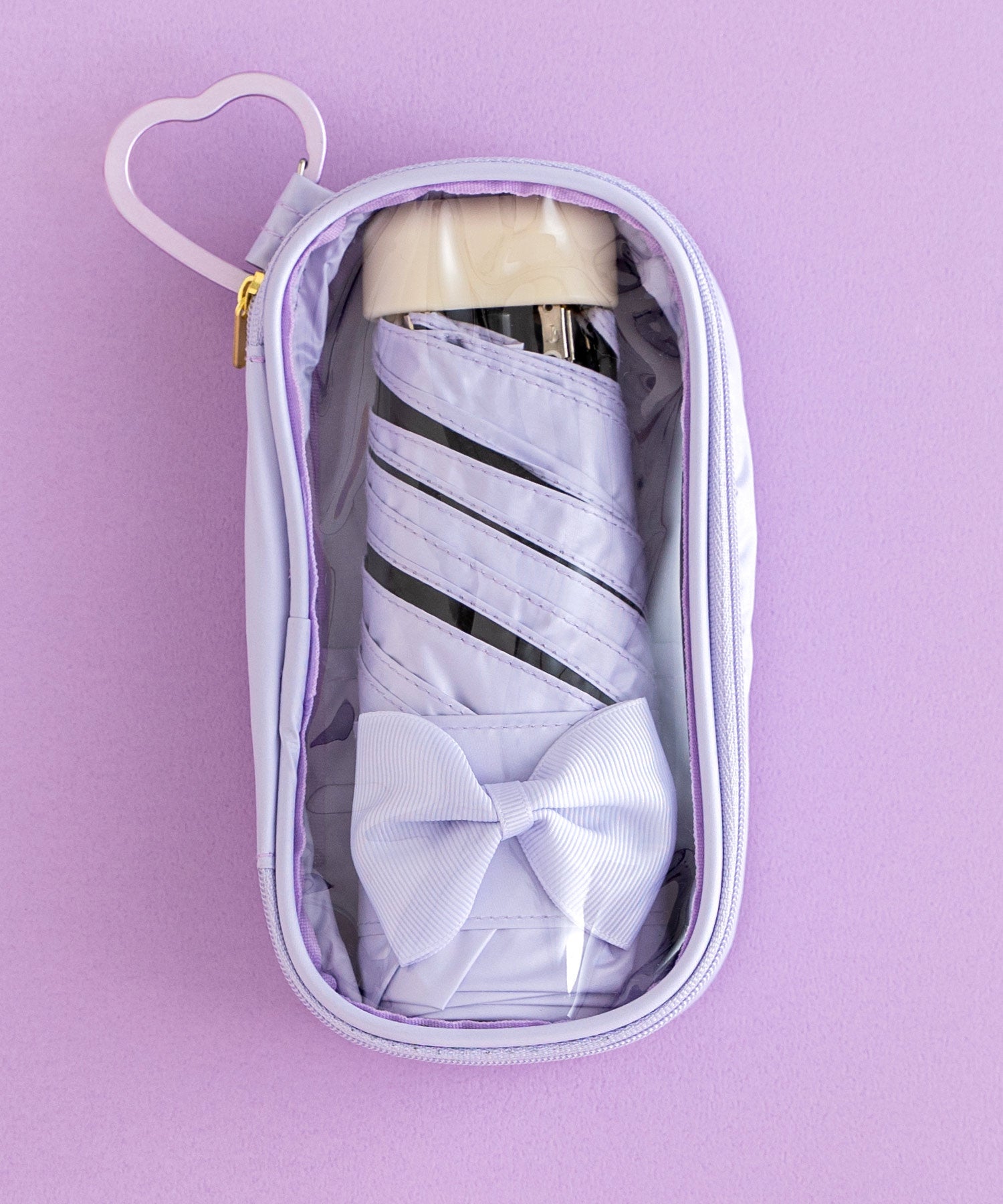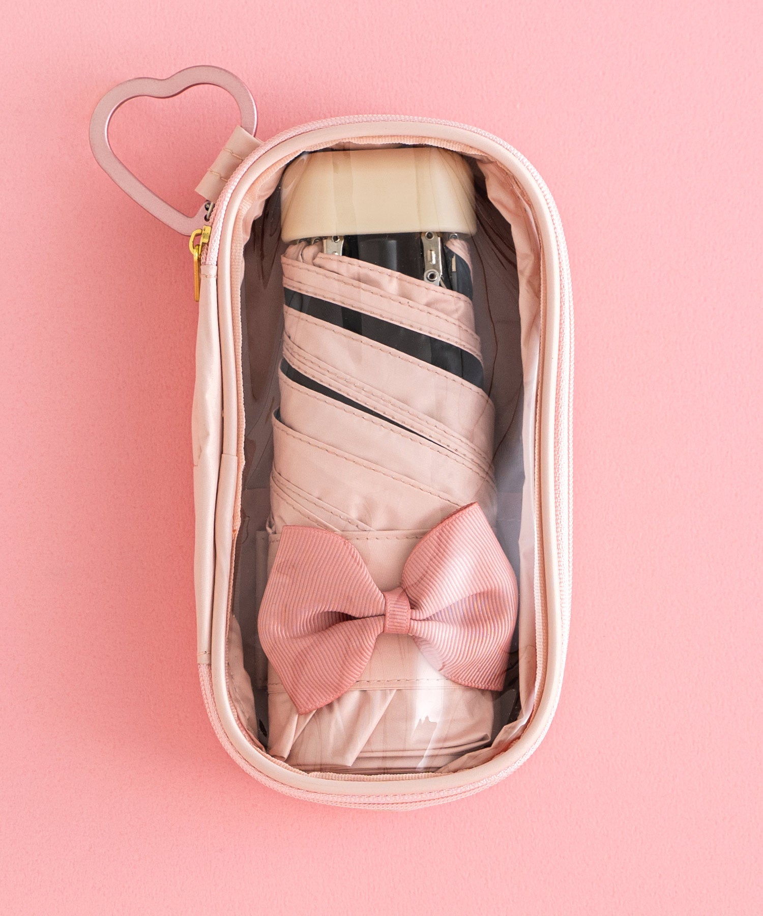 シンプルな無地デザインの傘にリボン付きの帯がワンポイントになっており、通勤・通学でも使いやすいデザインです。クリアポーチタイプの収納ケースは、間口が広いので傘が収納しやすく、リュックやトートバックにいつでも引っかけられて取り出しやすいハート型のカラビナ付き。傘を可愛く見せるだけでなく、背面ポケットにお気に入りのグッズなどを収納することができます。アクセサリー感覚で、ステッカーや推しのアイテムなど“好き”を詰め込むことで自分だけのオリジナル日傘に!