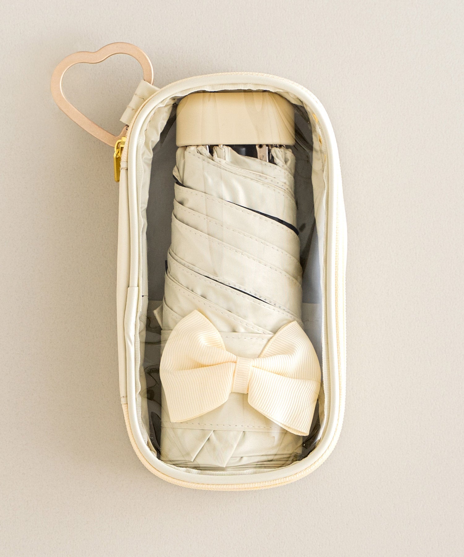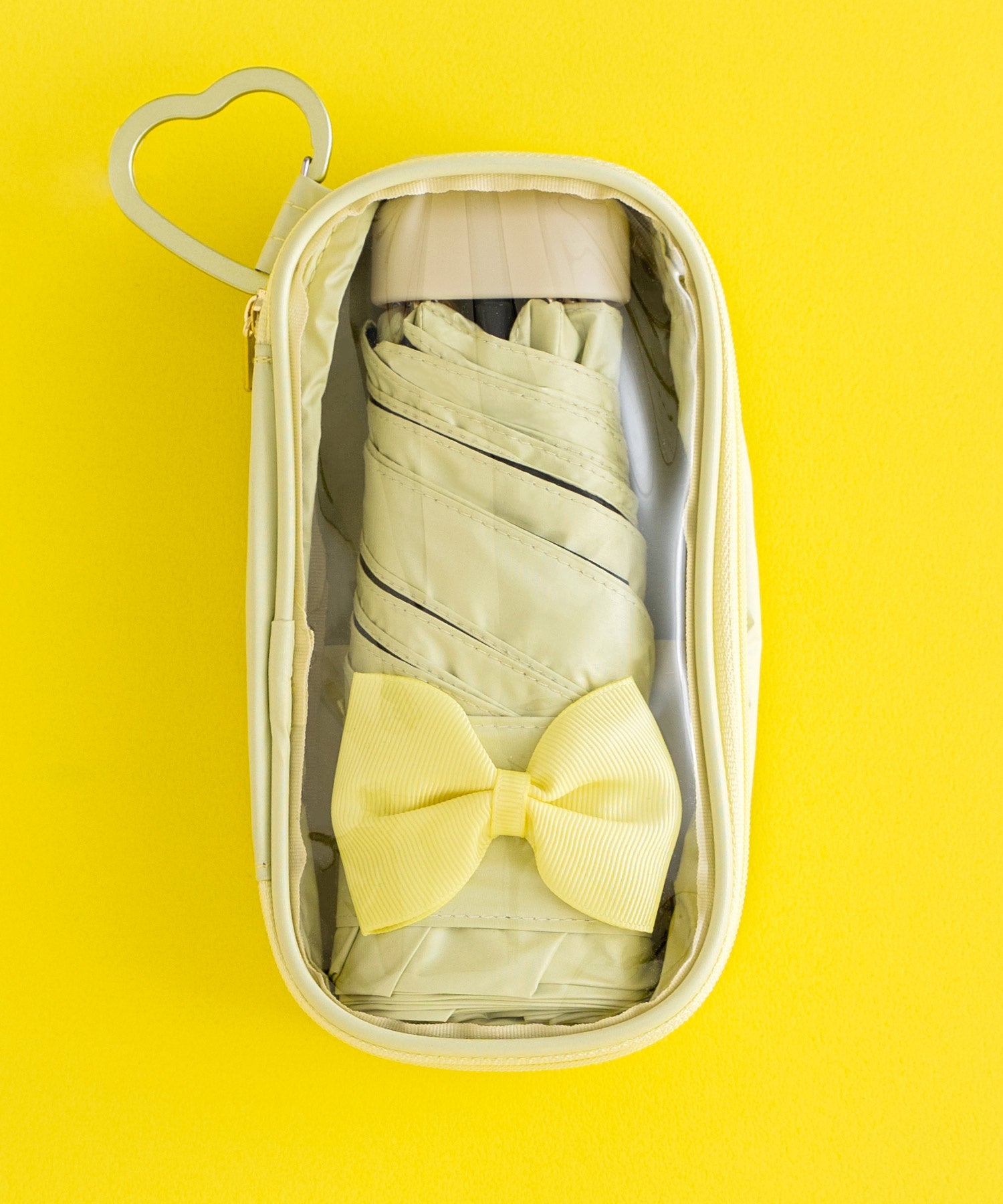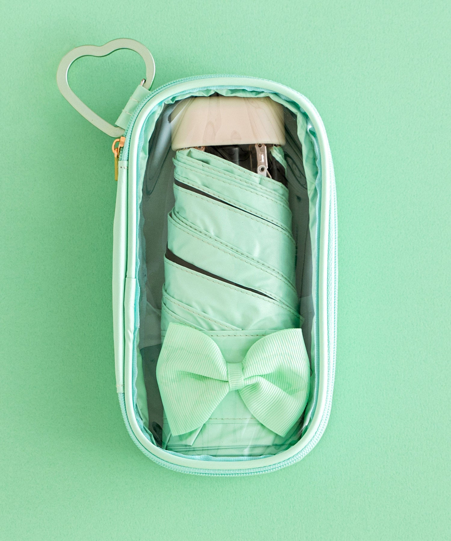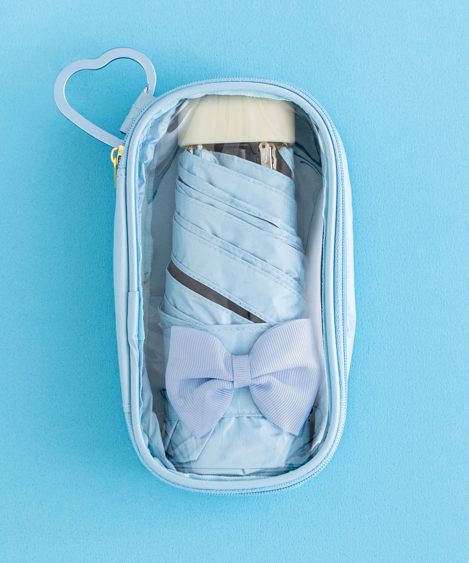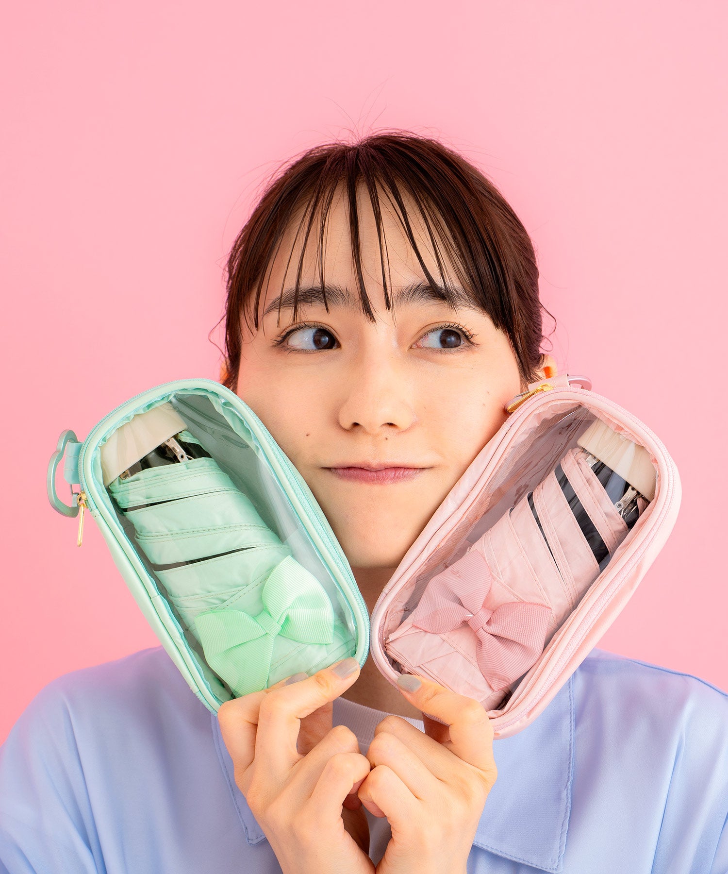 シンプルな無地デザインの傘にリボン付きの帯がワンポイントになっており、通勤・通学でも使いやすいデザインです。クリアポーチタイプの収納ケースは、間口が広いので傘が収納しやすく、リュックやトートバックにいつでも引っかけられて取り出しやすいハート型のカラビナ付き。傘を可愛く見せるだけでなく、背面ポケットにお気に入りのグッズなどを収納することができます。アクセサリー感覚で、ステッカーや推しのアイテムなど“好き”を詰め込むことで自分だけのオリジナル日傘に!