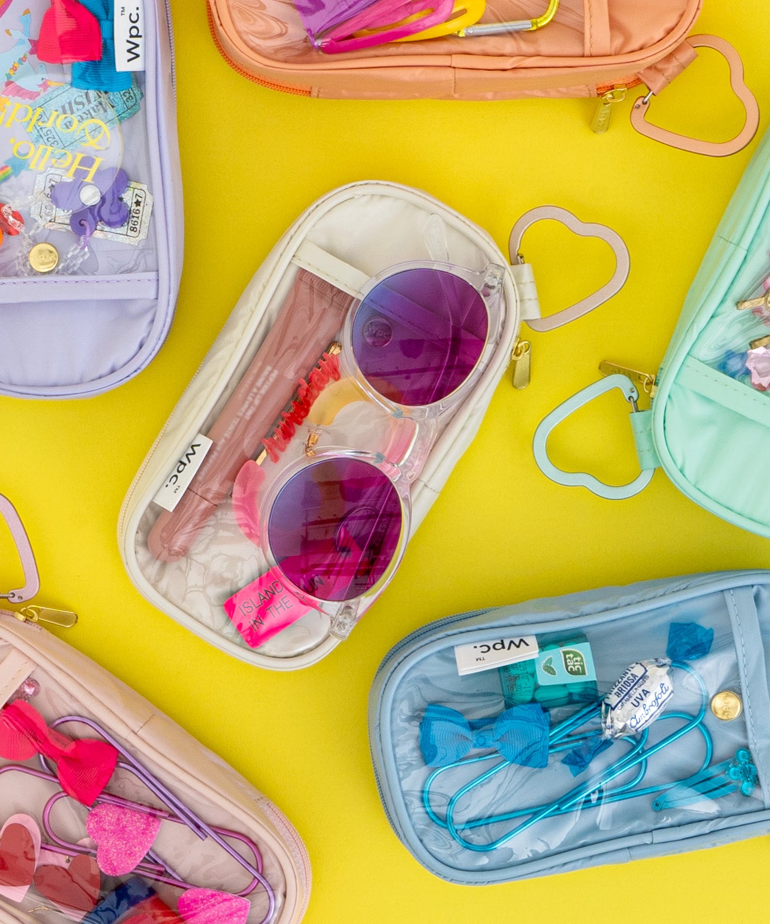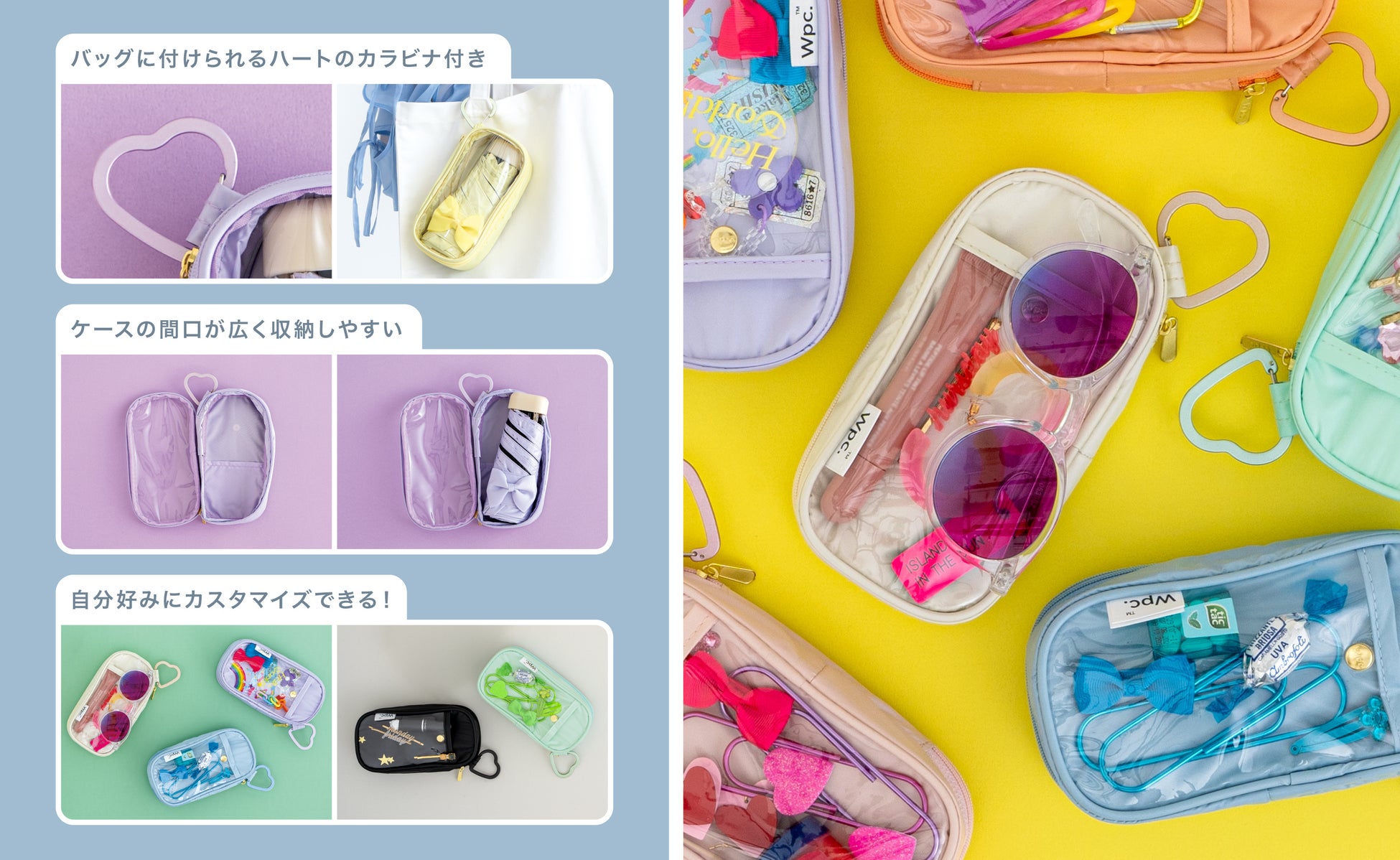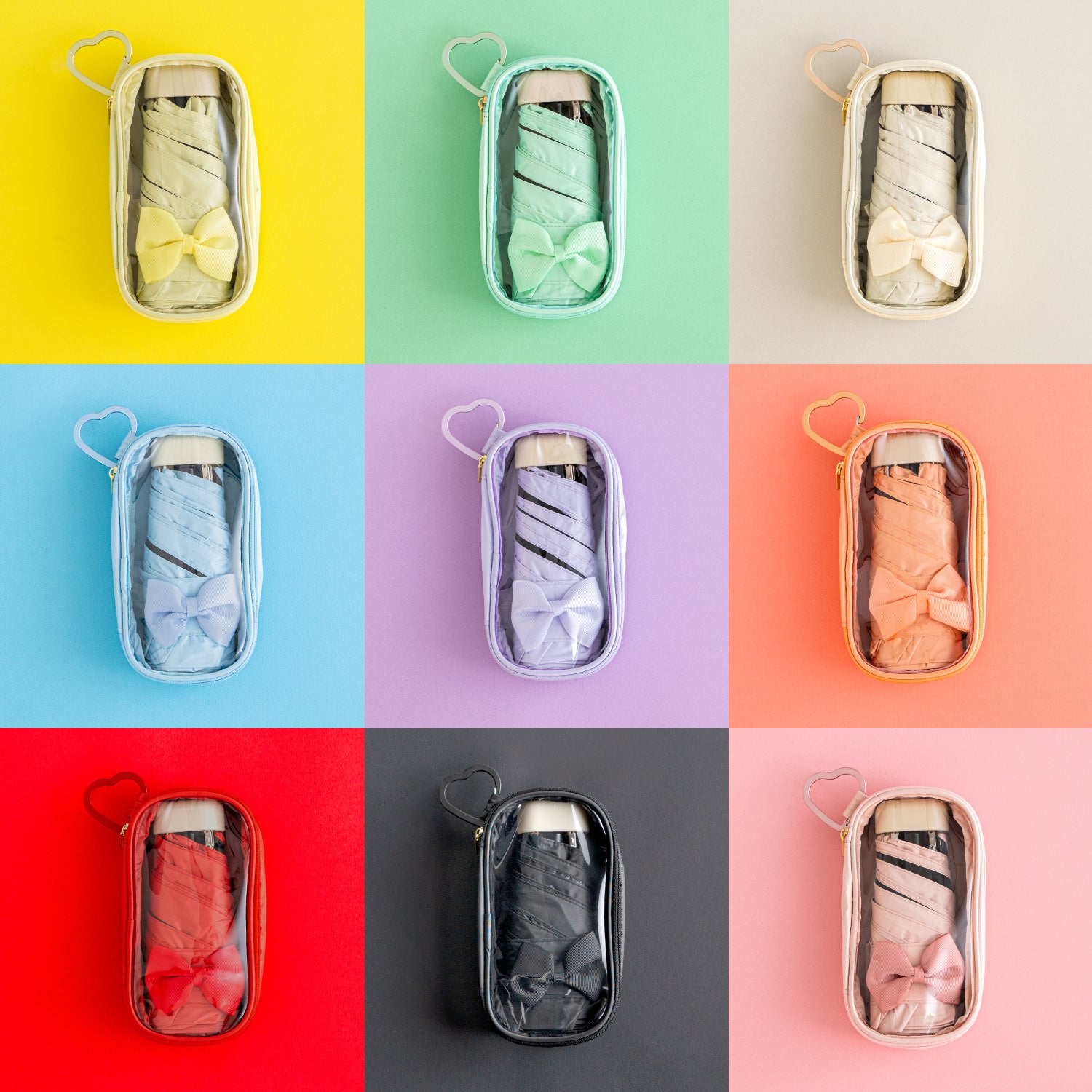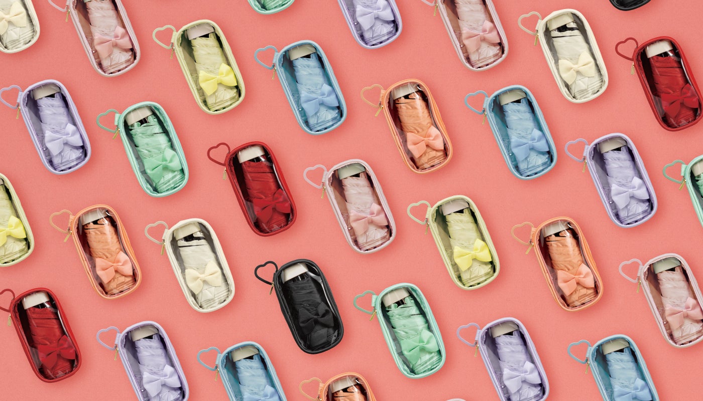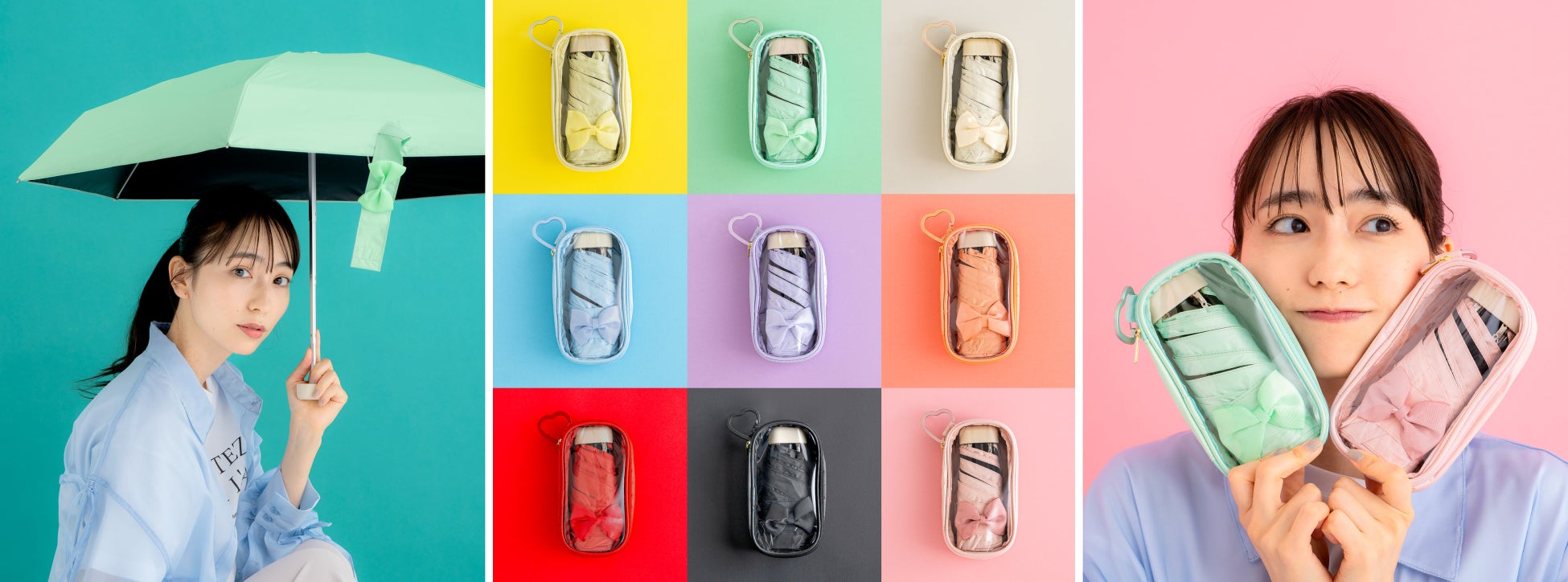 シンプルな無地デザインの傘にリボン付きの帯がワンポイントになっており、通勤・通学でも使いやすいデザインです。クリアポーチタイプの収納ケースは、間口が広いので傘が収納しやすく、リュックやトートバックにいつでも引っかけられて取り出しやすいハート型のカラビナ付き。傘を可愛く見せるだけでなく、背面ポケットにお気に入りのグッズなどを収納することができます。アクセサリー感覚で、ステッカーや推しのアイテムなど“好き”を詰め込むことで自分だけのオリジナル日傘に!