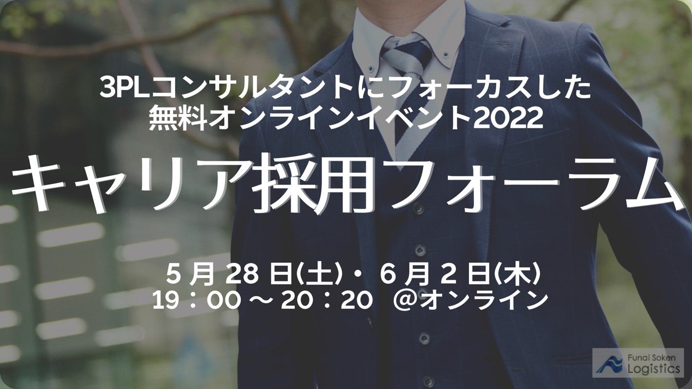 船井総研ロジ株式会社(代表:菅重宏、以下「船井総研ロジ」)は、3PLソリューションコンサルタントの業務内容をくわしく解説するイベント「船井総研ロジ 3PLソリューションコンサルタント キャリア採用フォーラム』をオンラインで開催します。採用フォーラムは、2022年5月28日(土)と6月2日(木)に開催します。