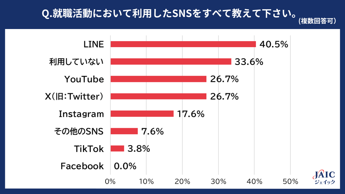 「就職活動において利用したSNSをすべて教えて下さい」と質問したところ、1位「LINE」が40.5%、2位「利用していない」が33.6%、3位「YouTube」「X(旧:Twitter)」が同率で26.7%となりました。