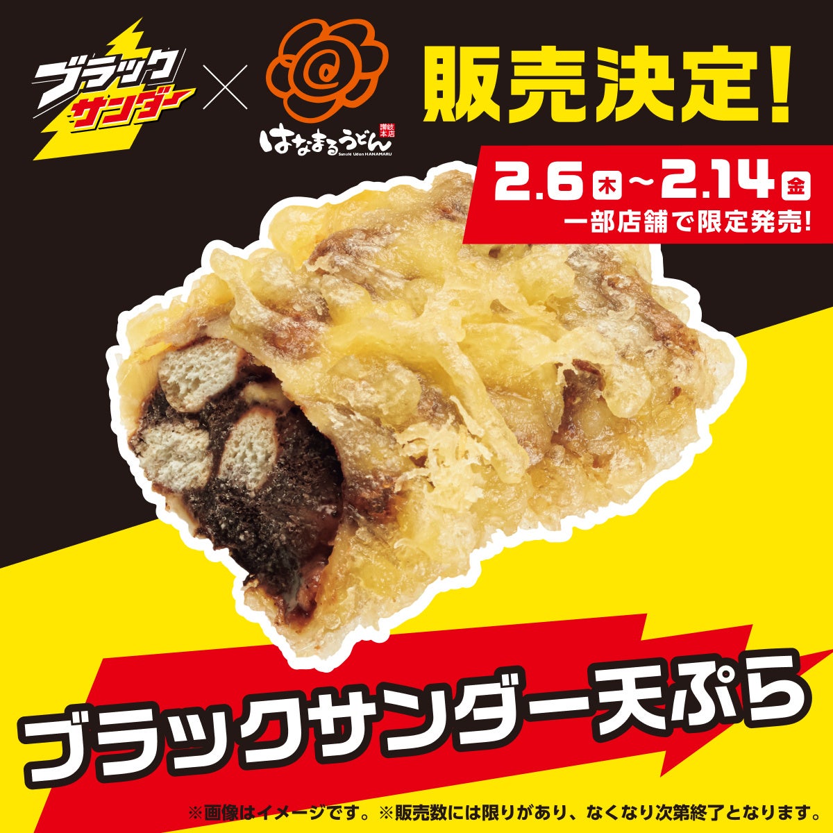 2月6日(木)より2月14日(金)まで、はなまるうどん10店舗で、ブラックサンダーを天ぷらにした「ブラックサンダー天ぷら」を期間中各販売店舗毎日先着30名様(お1人様1個)限定で販売いたします。また、2025年2月14日(金) バレンタインデーに、全国(※一部店舗除く)のはなまるうどんにて、フェアうどんをお買い上げいただき、はなまる公式アプリ画面をご提示いただいた方、各店先着20名様に、はなまるオリジナルバレンタインコラボパッケージのブラックサンダーをプレゼントいたします。