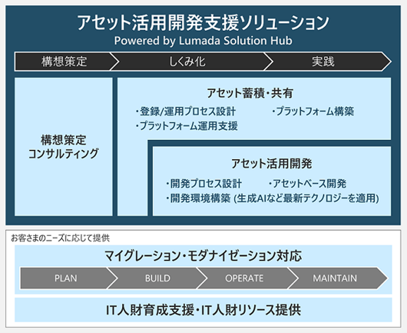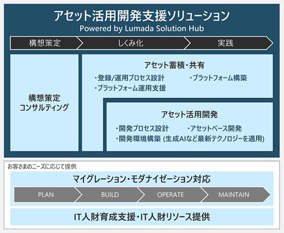 本ソリューションは、日立がデジタル事業を加速するためグループ全体で利用しているLumada Solution Hubのアセット活用の知見を集約し、お客さまのニーズに合わせて、必要な仕組みや開発環境をカスタマイズして提供するものです。具体的には、システム全体像の構想策定を支援するコンサルティングから、アセットを蓄積・共有するプロセス設計やプラットフォーム構築、生成AIなどの最新テクノロジーを安心して利用できる開発環境の構築、アセットを活用した開発(アセットベース開発*3)の支援まで、トータルでサポートします。