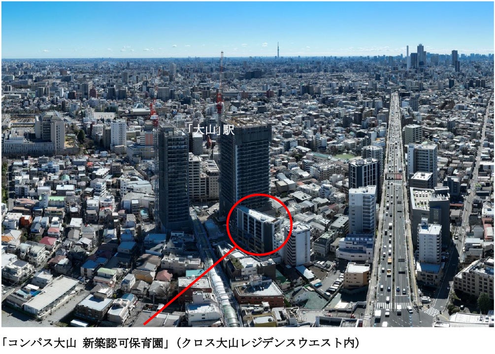 この度、完売いたしました「コンパス大山 新築認可保育園」は、東武東上線「大山」駅から徒歩約5分の再開発エリア(大山町クロスポイント周辺地区第一種市街地再開発事業)に位置し、2024年10月の開園を予定しております。「大山」駅から池袋まで約6分、池袋経由で新宿まで約20分、渋谷へも約30分と、都心主要エリアへのアクセスの良さは、多くの世代を魅了し、さらなる発展が期待できる街として人気上昇中のエリアです。
